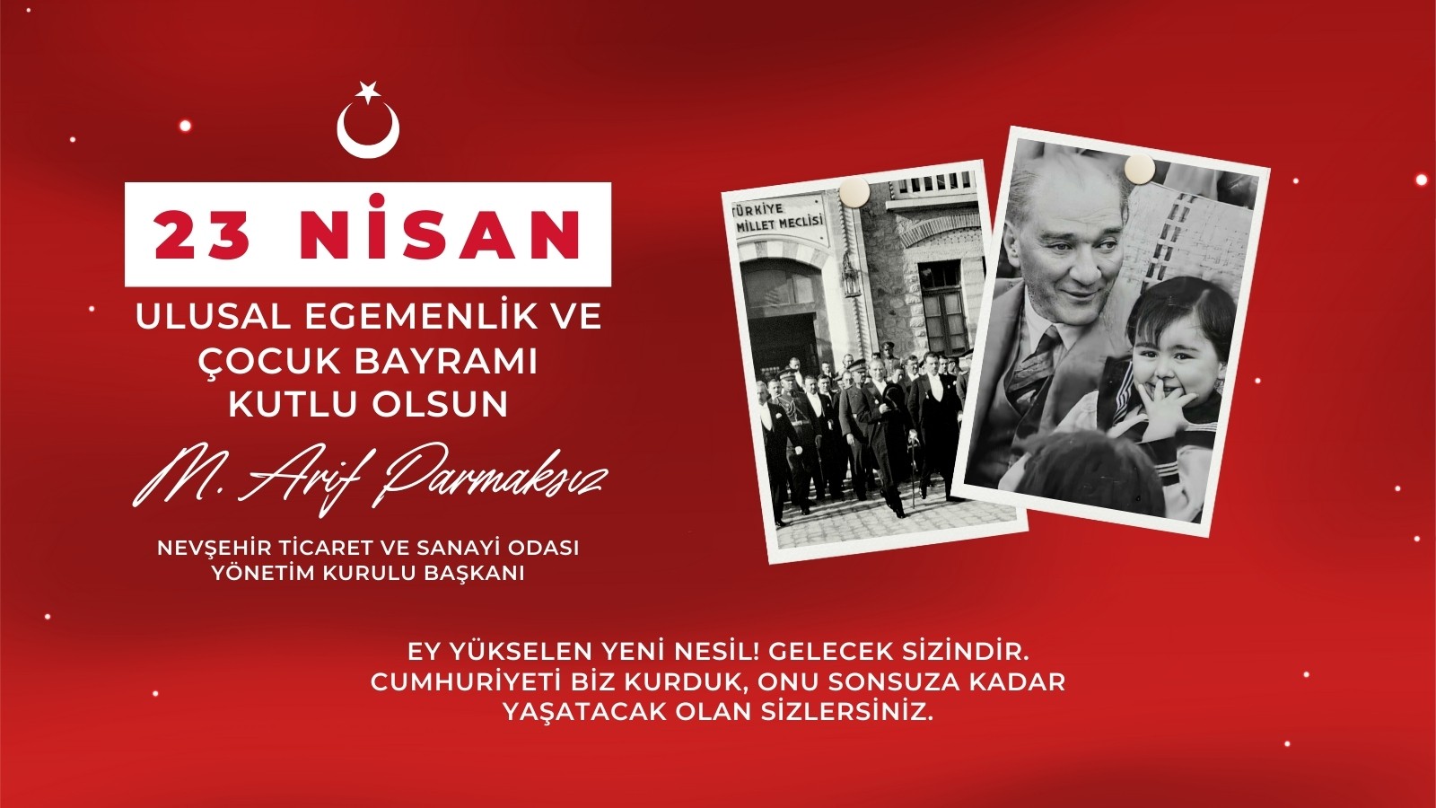 23 Nisan Ulusal Egemenlik ve Çocuk Bayramı dolayısıyla bir mesaj yayımlayan Nevşehir Ticaret ve Sanayi Odası Yönetim Kurulu Başkanı M. Arif Parmaksız Türkiye Büyük Millet Meclisinin kuruluş yıldönümü olan 23 Nisan’ın büyük bir gurur ve sevinçle kutlandığını belirterek, “Egemenliğin kayıtsız şartsız milletin olduğunu vurgulayan Gazi Mustafa Kemal Atatürk’ün milli ve manevi mirasına sahip çıkacağız. 23 Nisan, milletin kararı üzerinde başka bir güç olmadığının en güzel ifadesidir” dedi.
