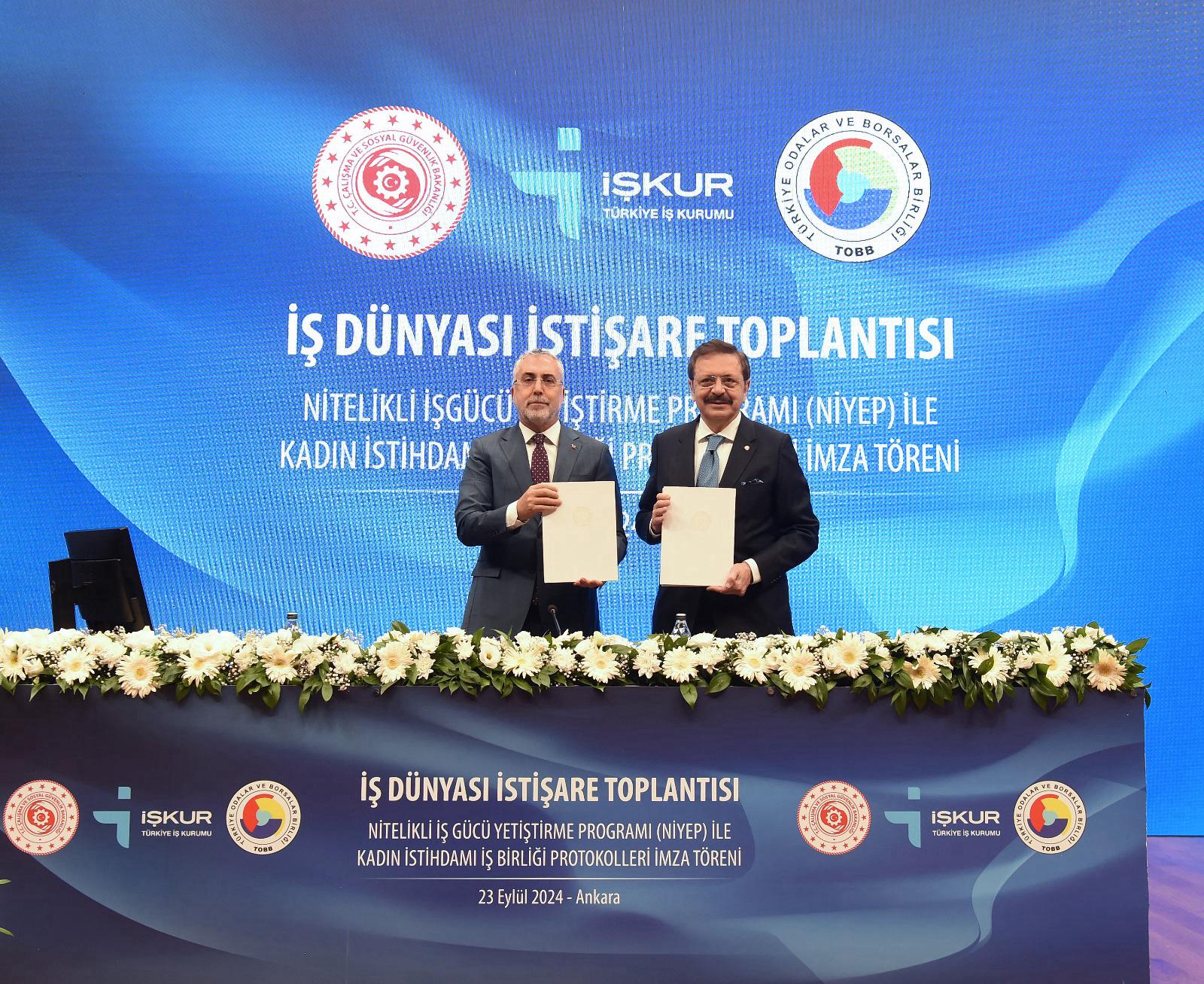 Toplantıda, Türkiye İş Kurumu (İŞKUR) ile TOBB arasında “Nitelikli İş Gücü Yetiştirme Programı (NİYEP)” ile “Kadın İstihdamı İş Birliği” protokolleri imzalandı.