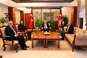 Nevşehir Ticaret Borsası (NTB) Yönetim Kurulu Başkanı İbrahim Salaş beraberinde, Fuar Organizatörü Zümrüt Fuarcılık Yönetim Kurulu Başkanı Mehmet Yıldız ve Nevşehir Ziraat Odası Başkanı Kahraman Kaya ile birlikte Nevşehir Valisi Ali Fidan’ı makamında ziyaret ettiler.