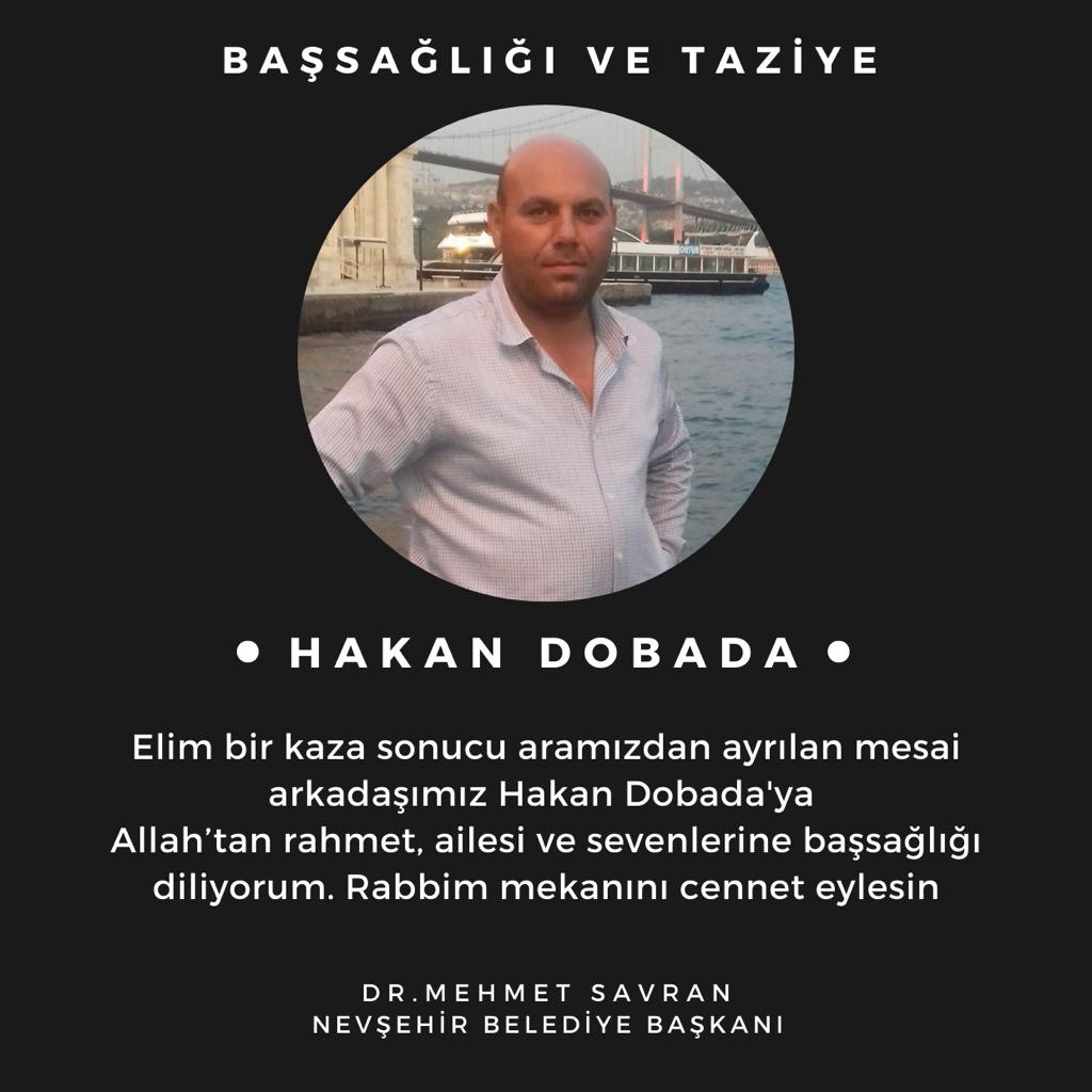 Nevşehir Belediye Başkanı Dr. Mehmet Savran, geçirdiği trafik kazası sonrası tedavi gördüğü hastanede hayatını kaybeden Nevşehir Belediyesi Su ve Kanalizasyon Müdürlüğü personellerinden Hakan Dobada için taziye mesajı yayımladı.