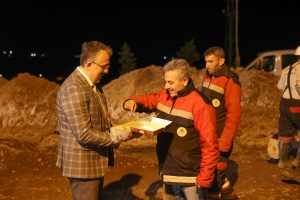 Nevşehir Belediye Başkanı Dr. Mehmet Savran, gece altyapı çalışmalarında görev yapan belediye işçilerine tatlı ikramında bulunarak kolaylıklar diledi.