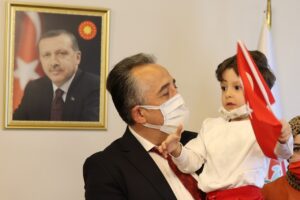 Minik ziyaretçilerini başkanlık makamı girişinde karşılayan Savran, öğrencilere Türk bayrağı ve çeşitli hediyeler dağıttı.