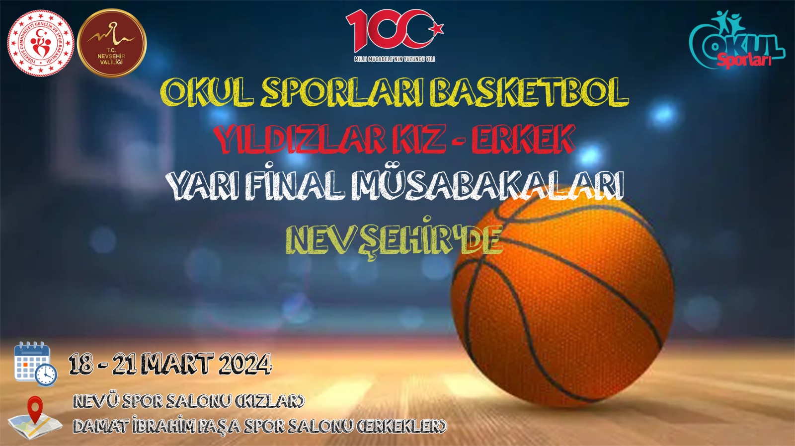 2023-2024 Yılı Okul Sporları Basketbol Yıldızlar Kız – Erkek Yarı Final Müsabakaları 18 – 21 Mart 2024 tarihleri arasında ilimiz ev sahipliğinde Damat İbrahim Paşa Spor Salonunda(Erkekler) ve Nevşehir Hacı Bektaş Veli Üniversitesi Spor Salonunda(Kızlar) düzenlenecek.