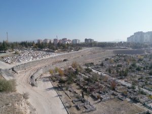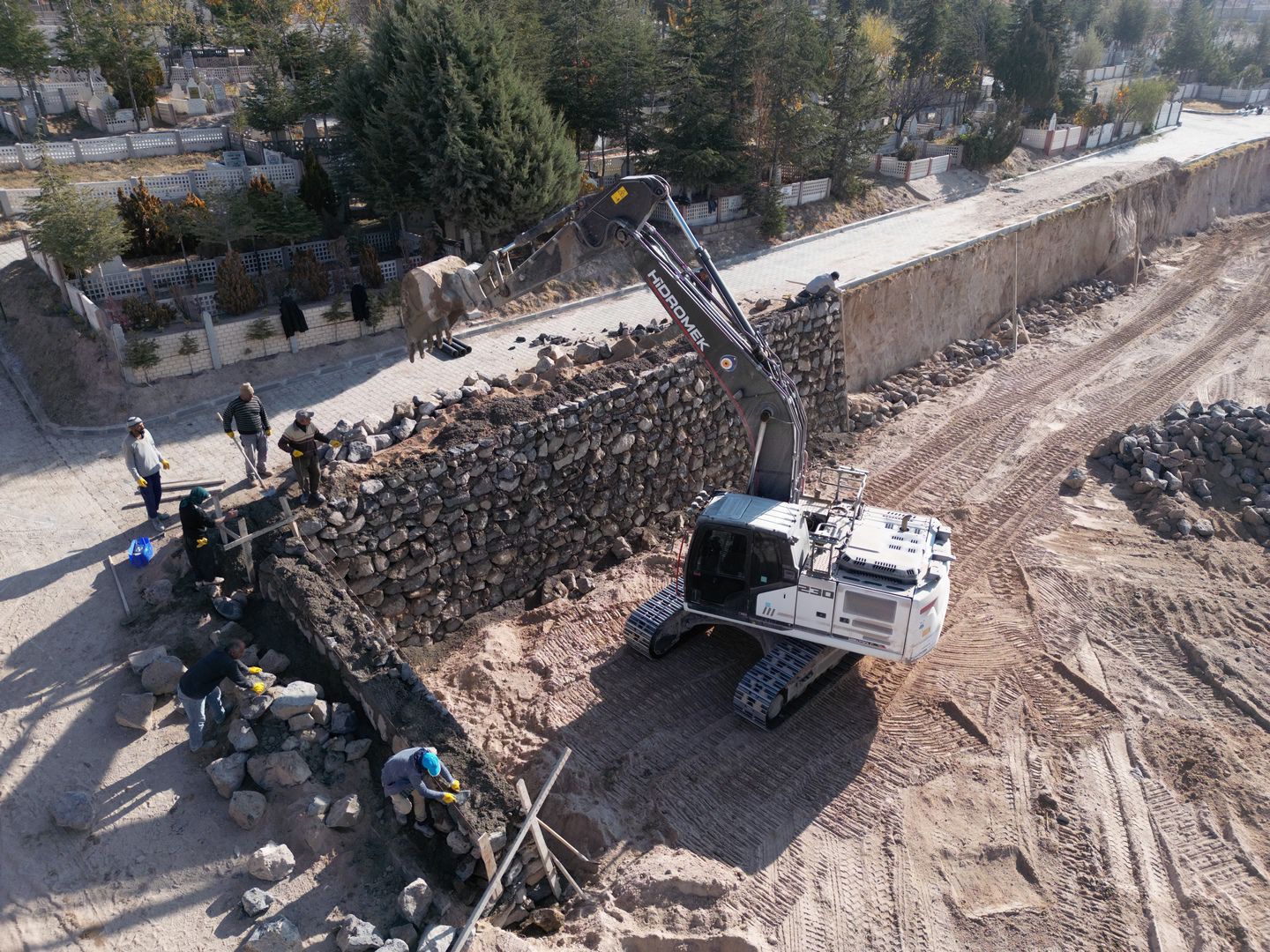 Nevşehir Belediyesi tarafından Kaldırım Mezarlığı’ndaki iki ayrı noktada başlatılan istinat duvarı yapım çalışması sürüyor. Bekdik Mahallesi yol kenarındaki 240 metre uzunluğundaki duvar imalatını tamamlayan belediye ekipleri, mezarlık alanı içerisinde devam eden çalışmalarıyla da mezarlığa 8 bin metre kare büyüklüğünde yeni bir alan kazandırdı.
