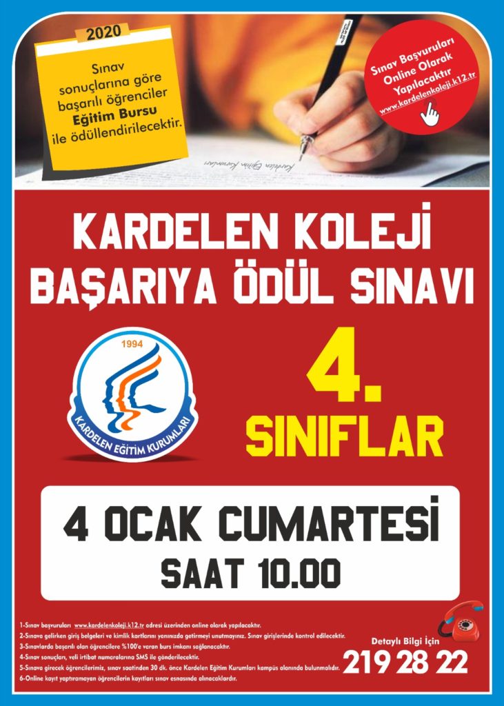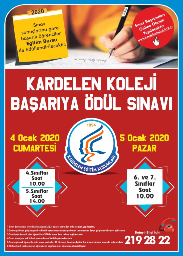 Kardelen Eğitim Kurumları 4- 5 ve 11 Ocak tarihlerinde il genelinde yapılacak olan sınavla öğrencilere Kardelen Kolejinde okuma fırsatı sunuyor.