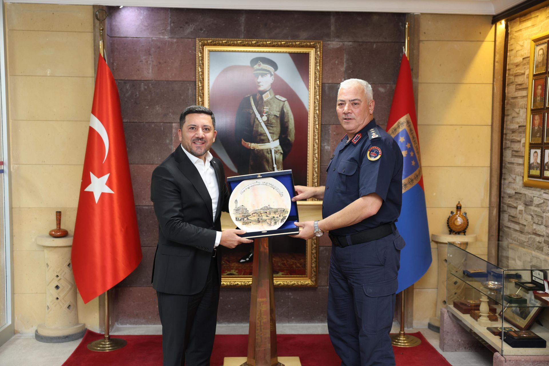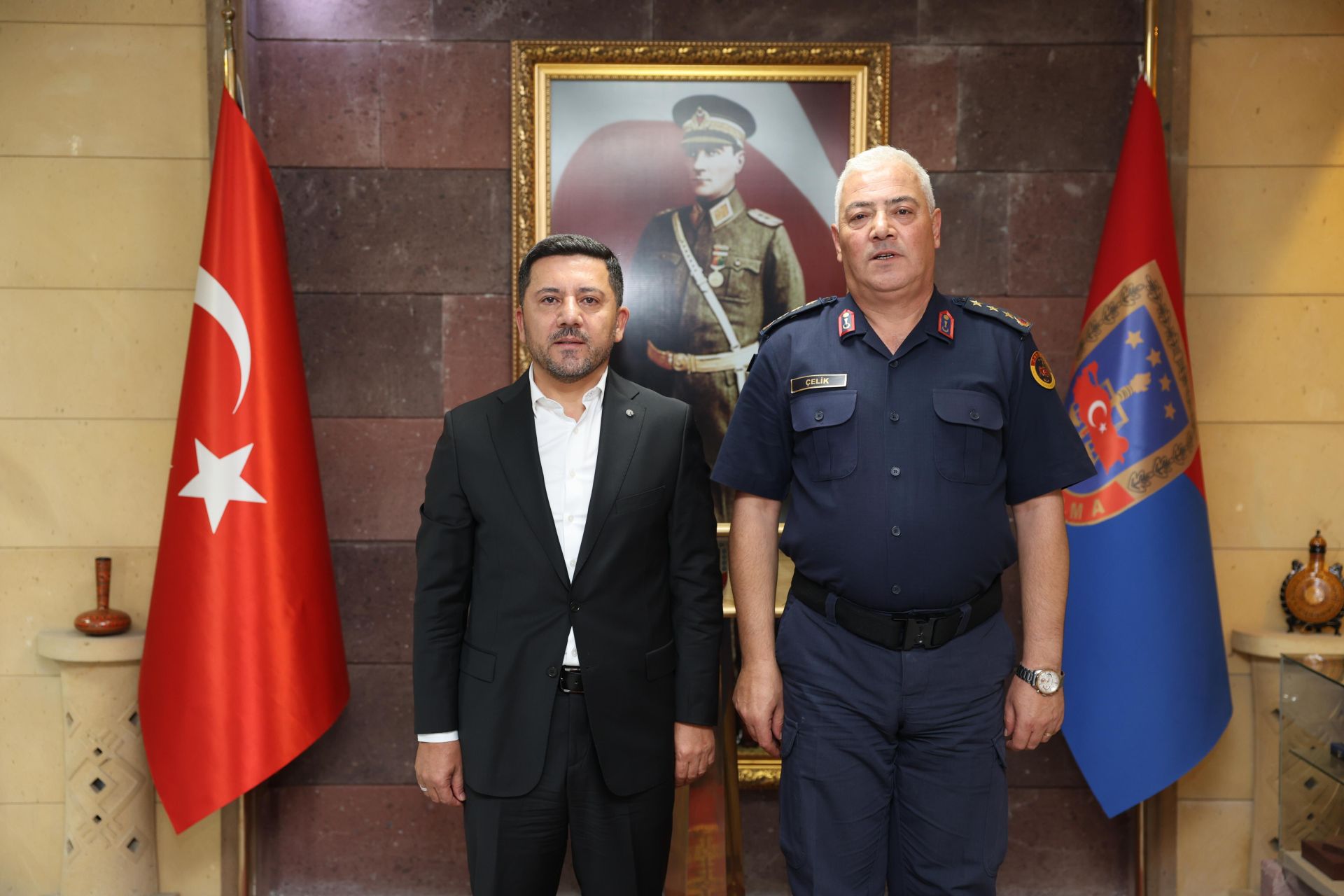 Belediye Başkan Rasim Arı, Belediye Başkan Yardımcısı İbrahim Yüzer ile birlikte 2025/294 sayılı Cumhurbaşkanı Kararı ile Nevşehir İl Jandarma Komutanı olarak göreve atanan Jandarma Kıdemli Albay Mehmet Çelik’i makamında ziyaret etti.