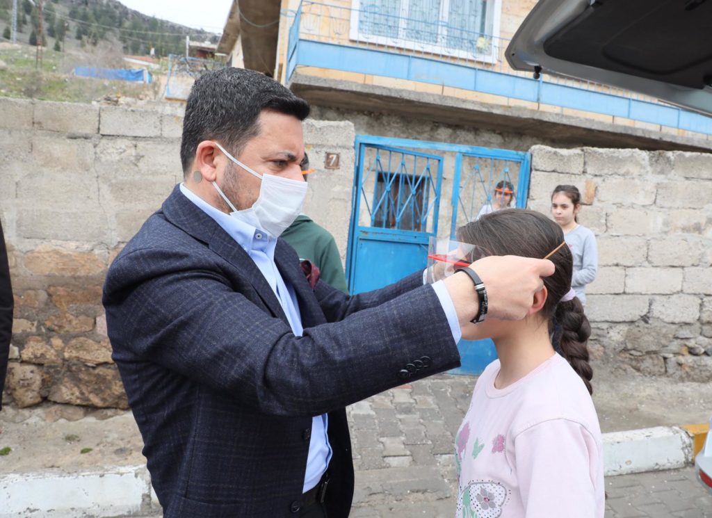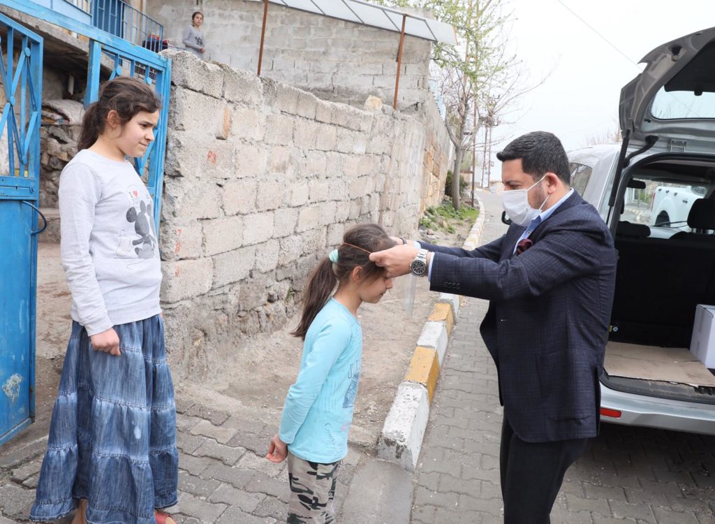 Belediye Başkanı Rasim Ari, Nevşehir Belediyesi Hizmet Binası önünde vatandaşlara maske ve incelemelerde bulunmak üzere gittiği Mehmet Akif Ersoy Mahallesi’nde çocuklara yüz koruyucu siperlik dağıttı.