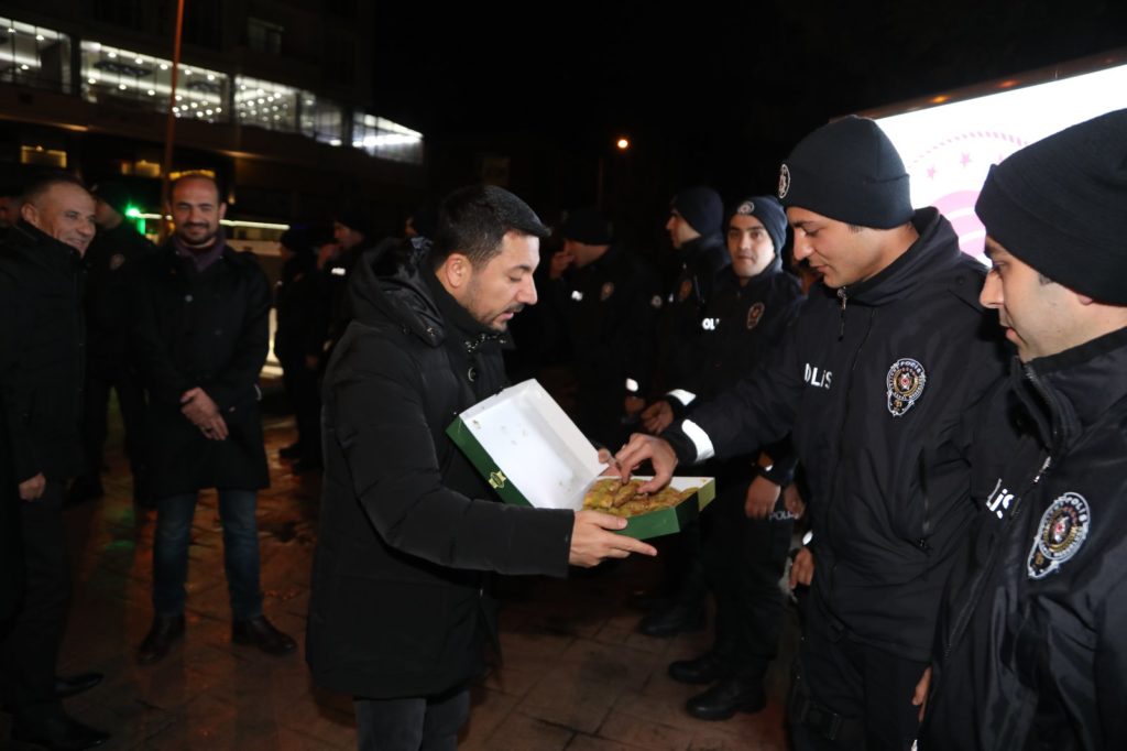 Burada nöbet tutan güvenlik güçlerinin yeni yılını kutlayan ve görevlerinde kolaylıklar dileyen Başkan Arı, polis memurlarına baklava ikram etti.