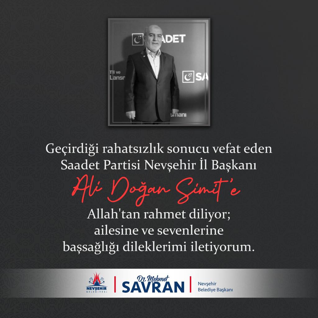 Belediye Başkanı Savran, mesajında, “Vefat haberini derin bir üzüntü ile öğrendiğim SP Nevşehir İl Başkanı Ali Doğan Simit’e Allah’tan rahmet niyaz ediyor, ailesi ve sevenlerine başsağlığı diliyorum.” ifadesini kullandı.