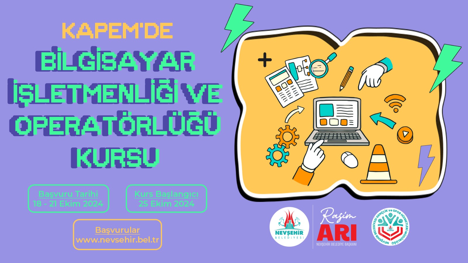 Nevşehir Belediyesi Gençlik ve Spor Hizmetleri Müdürlüğü bünyesinde faaliyetlerini sürdüren KAPEM’de, Bilgisayar İşletmenliği ve Operatörlüğü Kursu açılacak. Ücretsiz olarak açılacak olan kursa dileyen tüm gençler ücretsiz olarak katılabilecek.