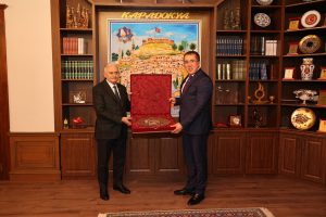 Belediye Başkanı Savran, Yıldırım’a Nevşehir Belediyesi’nin hayata geçirdiği ve devam eden çeşitli projeleri hakkında bilgi verdi. Başkan Savran, ziyaret anısına Yıldırım’a hediye takdiminde bulundu.