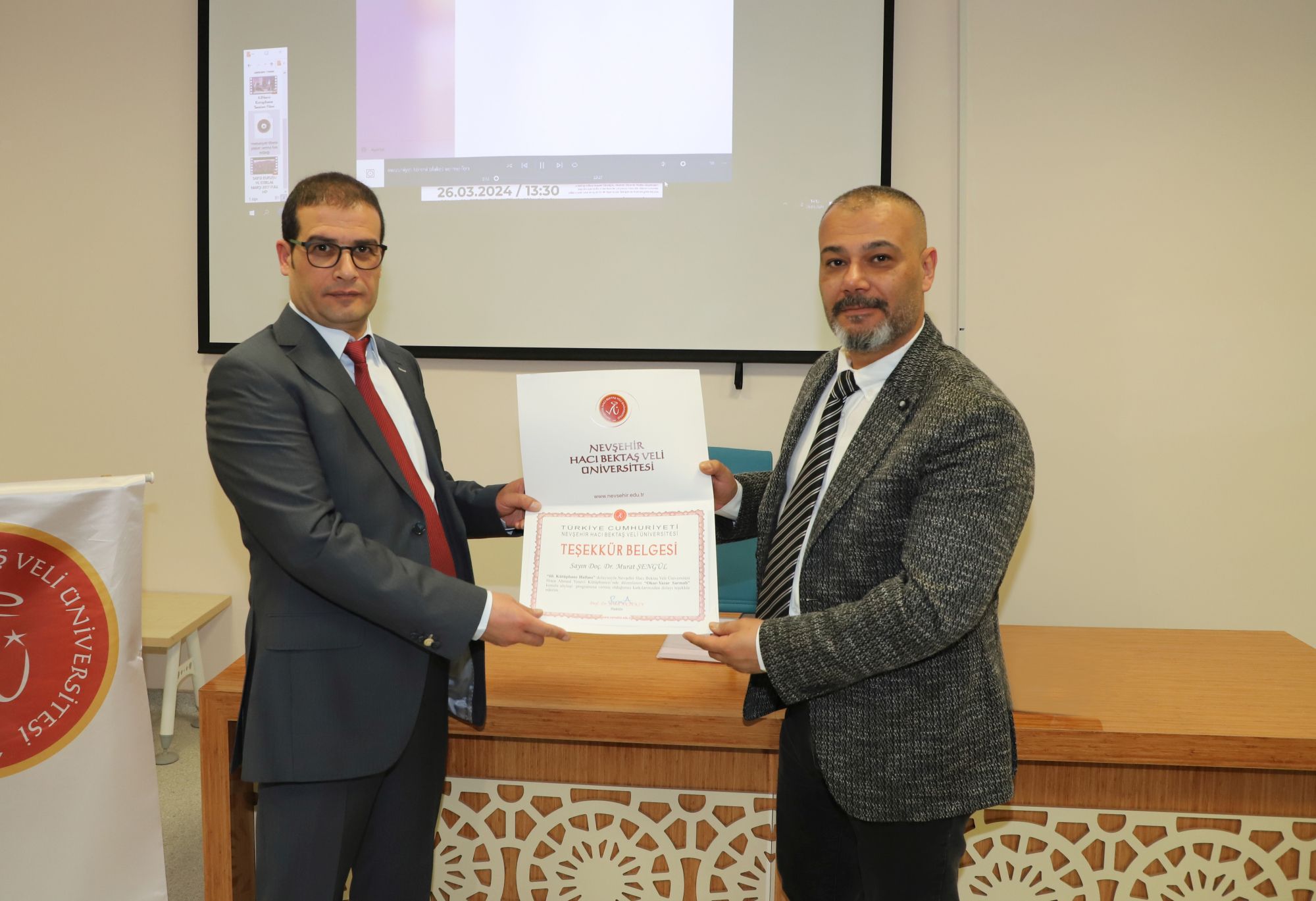 Rektör Yardımcısı Prof. Dr. Öztürk söyleşinin ardından Doç. Dr. Murat Şengül’e düzenlenen etkinliğe vermiş olduğu katkılardan dolayı teşekkür belgesi takdim etti.