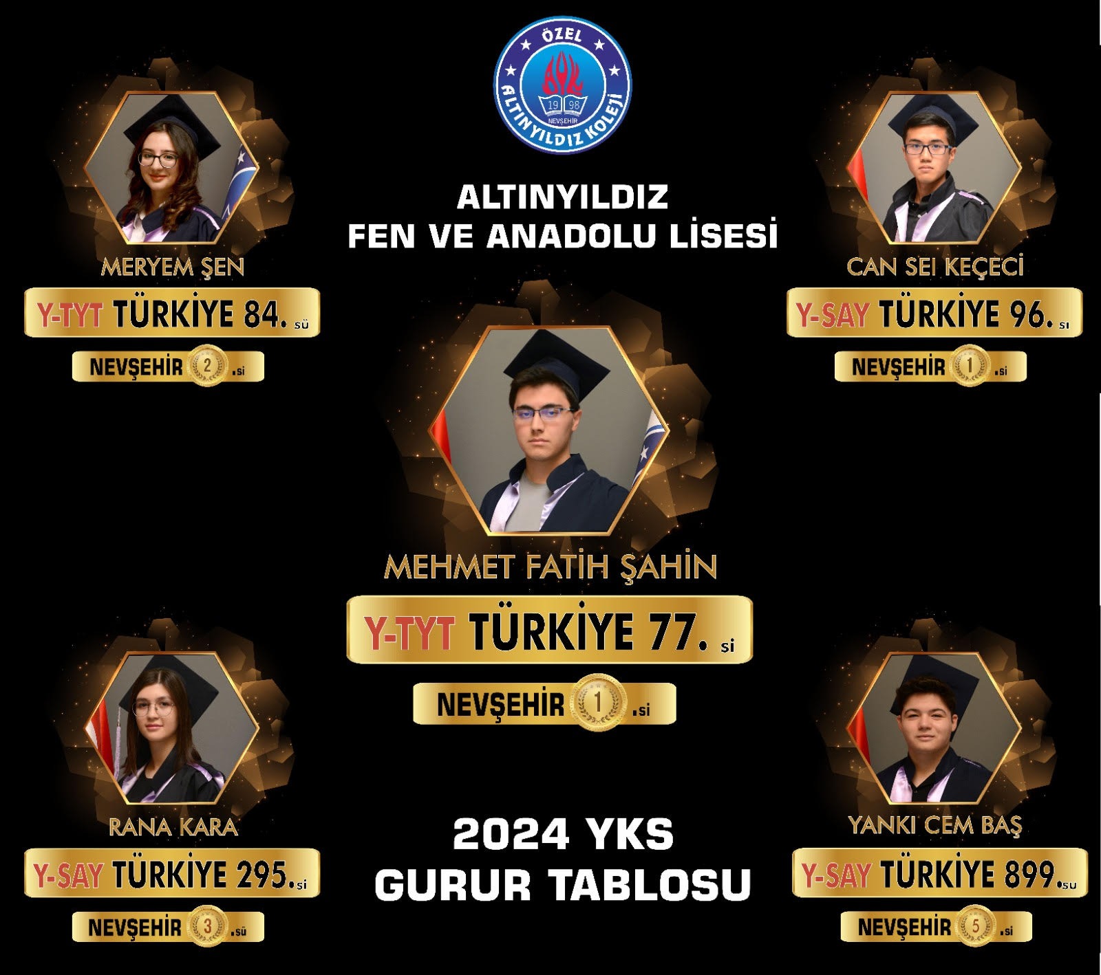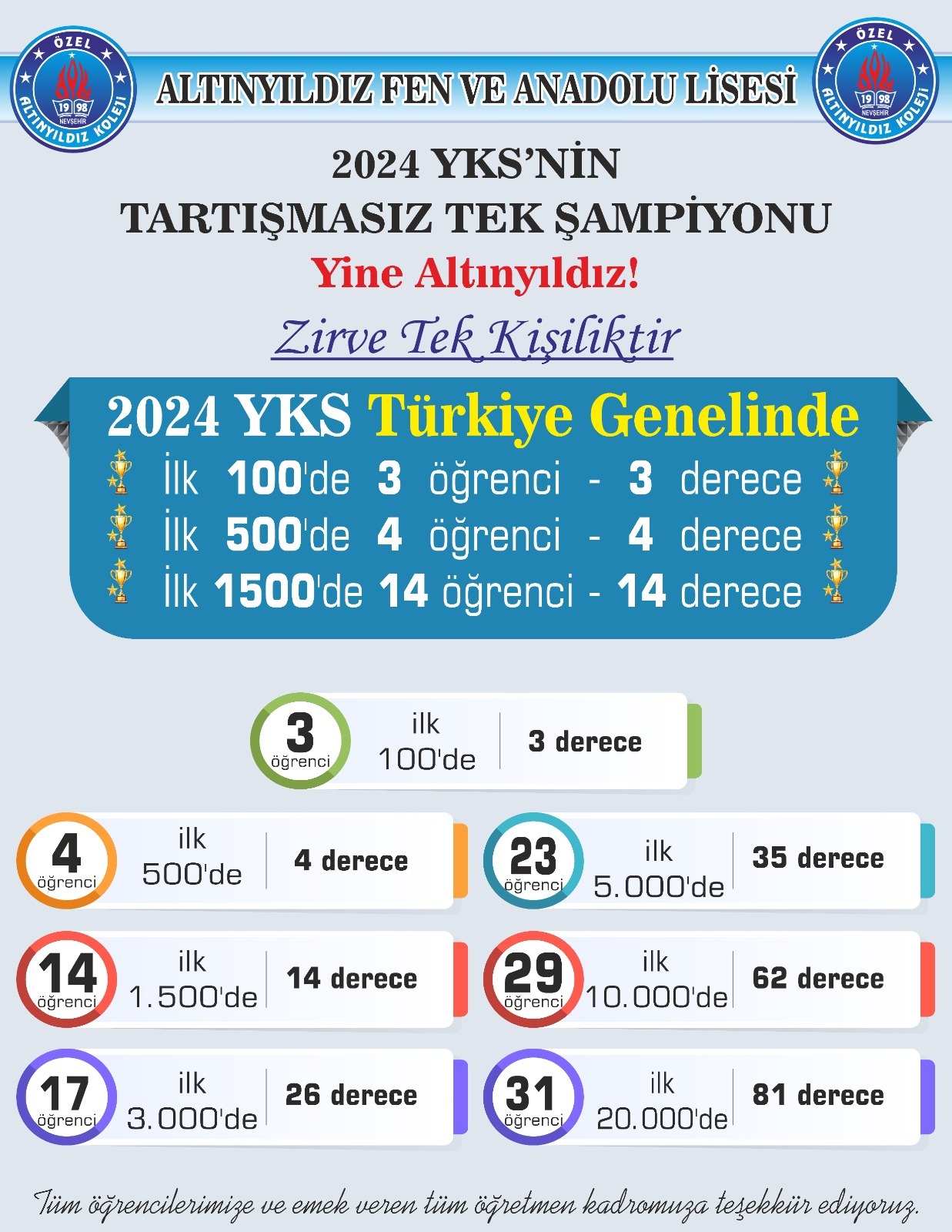 16.07.2024 tarihinde ÖSYM tarafından açıklanan YKS resmî sonuçlarına göre Altınyıldız Koleji Fen ve Anadolu Lisesi öğrencileri: