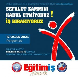Birleşik Kamu-İş Sendikası Nevşehir İl Temsilcisi İbrahim Demir, “Sefalet zammını kabul etmiyoruz. İş bırakıyoruz. 12 Ocak 2023 Perşembe günü tüm Türkiye’de Birleşik Kamu İş’e bağlı sendikalarla birlikte iş bırakıyoruz” açıklamasında bulundu.