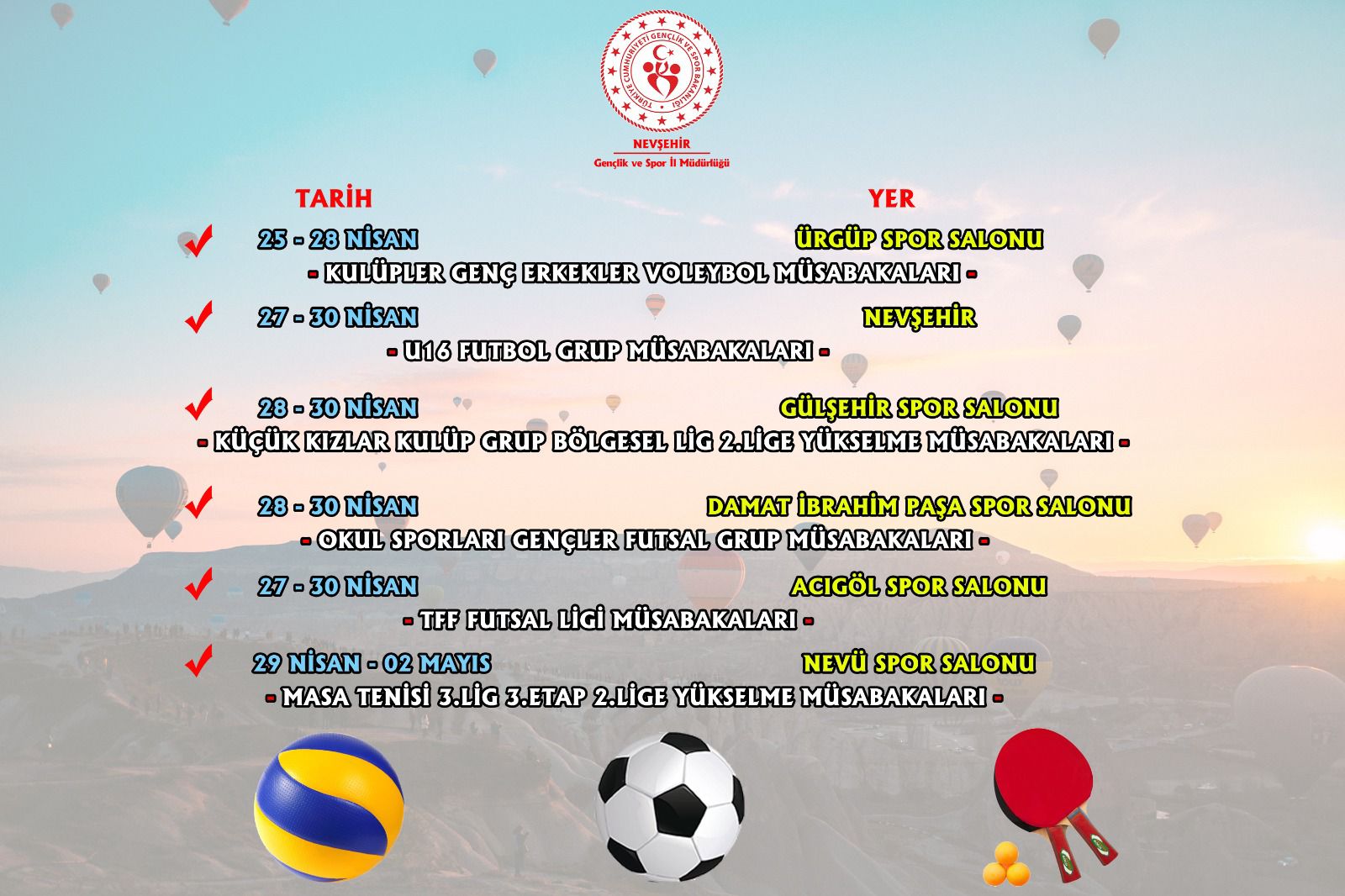 İlimiz ev sahipliğinde 25 Nisan – 02 Mayıs 2023 tarihleri arasında Voleybol, Futbol, Futsal ve Masa Tenisi branşlarında grup, bölge ve bölgesel lig müsabakaları gerçekleştirilecek.