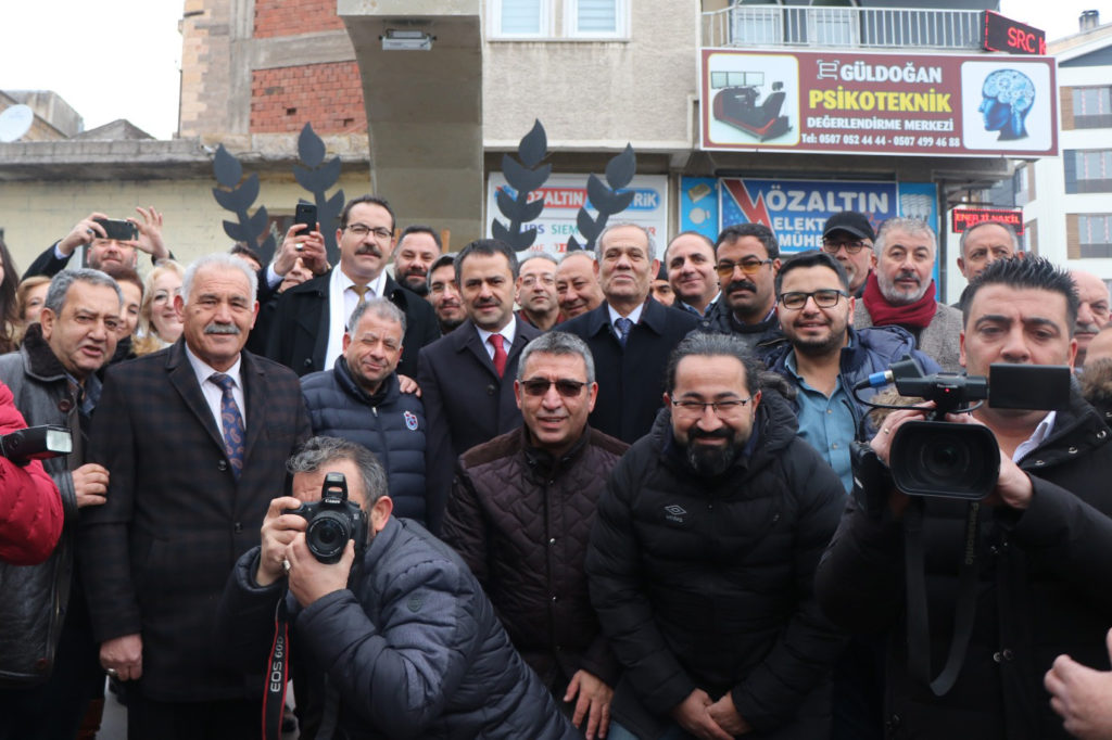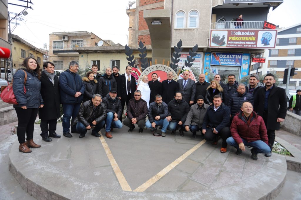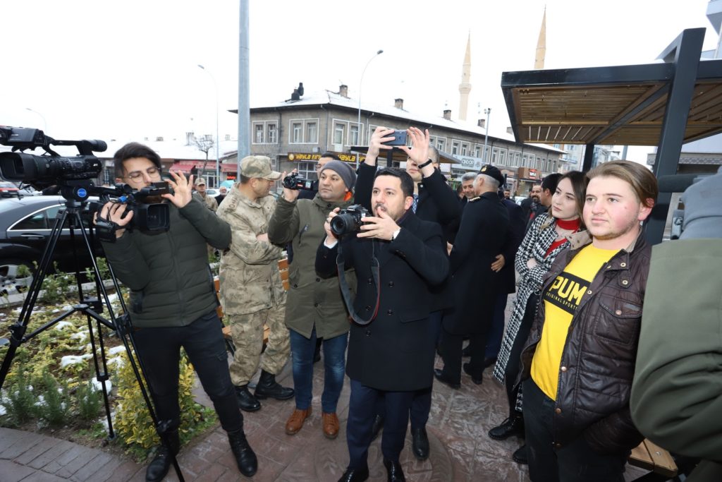 Anıt açılışının ardından protokol üyeleri ve gazetecilerle hatıra fotoğrafı çektiren Arı, bir muhabirin fotoğraf makinesini alarak gazetecilerin fotoğrafını çekti.