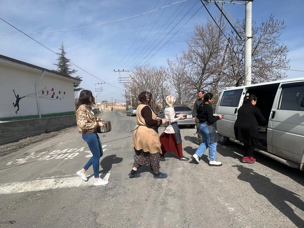 Deprem sonrası Nevşehir’e gelen afetzede aileler, köy yaşam merkezinde köylü kadınlar ile birlikte yemek yapıyor, yaptığı yemekleri de yine depremzede ailelere dağıtarak vakit geçiriyor.