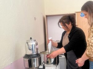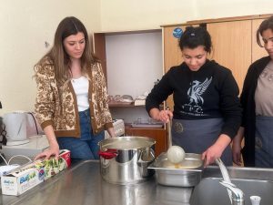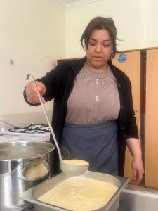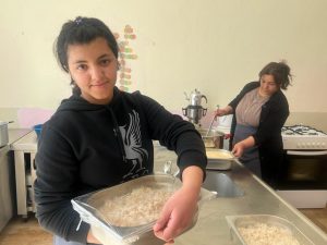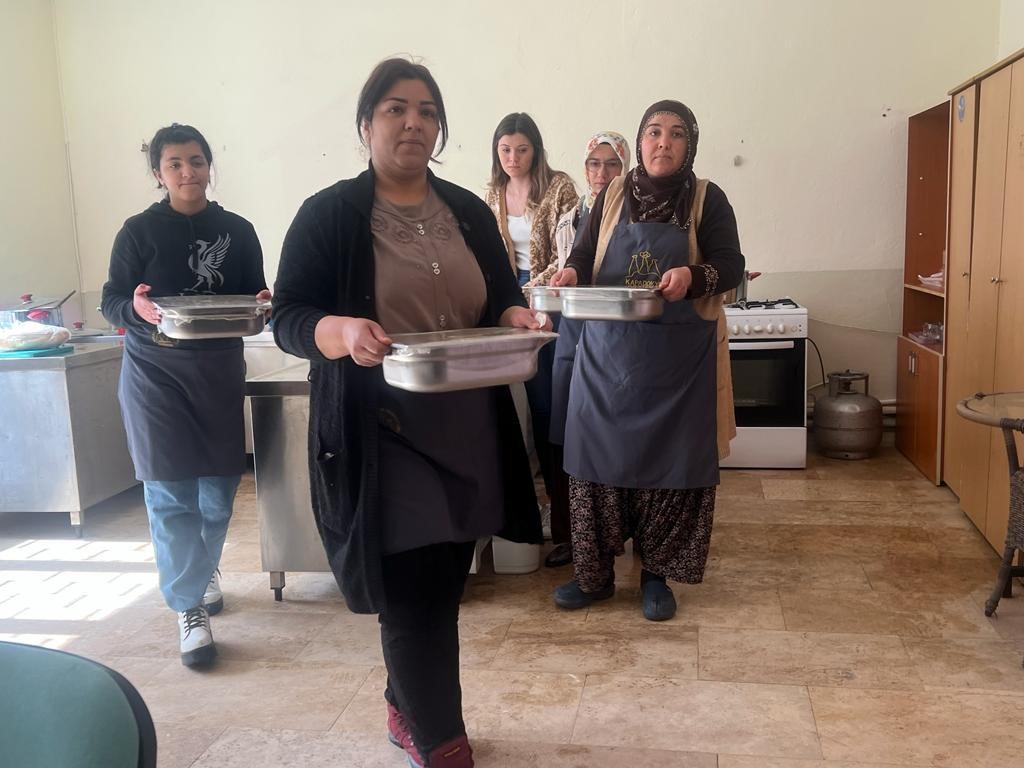 Ayvalı’da yaşamlarına devam eden depremzede kadınlar da bu uygulamaya destek veriyor. Köy yaşam merkezindeki aşçı yardımcılığı kursuna gelen afetzede kadınlar hem yemek yapımına hem de yemek dağıtımına yardım ederek vakit geçiriyor.