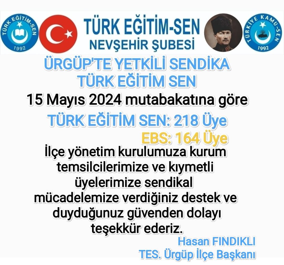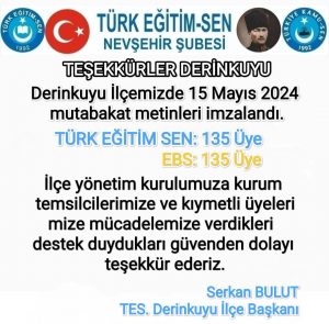Türk Eğitim Sen Nevşehir şubesinden yapılan açıklamalarda; Türk Eğitim Sen’i yetkili kılan değerli eğitim çalışanlarına, kıymetli üyelerimize, kurum temsilcilerimize, kadın komisyonumuza, il ve ilçe yönetim kurullarımıza sendikal mücadelemize vermiş oldukları desteklerden dolayı teşekkür ederiz. İnsanı yaşat ki devlet yaşasın ilkesi ile etkili ve yetkili sendika olarak mücadelemizi devam ettireceğiz. İfadeleri kullanıldı.
