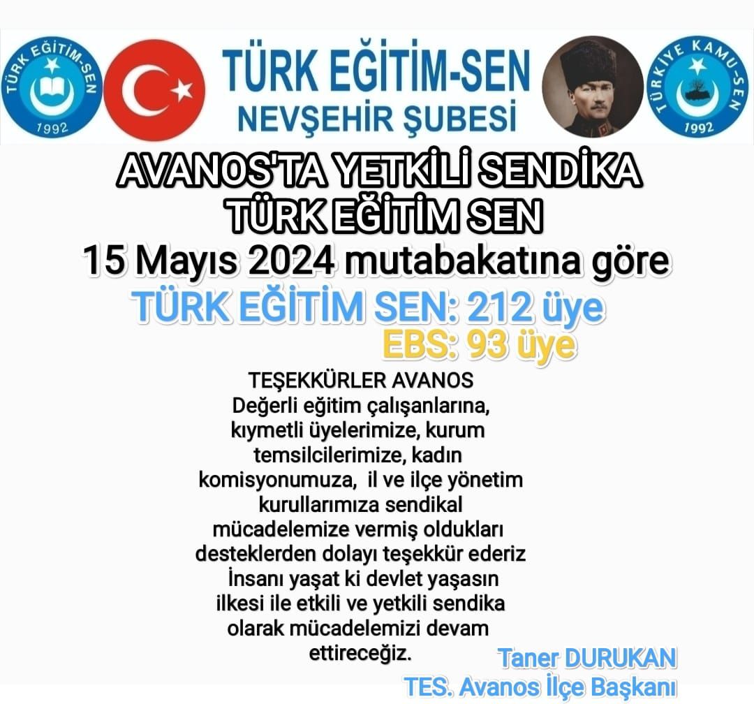 Türk Eğitim Sen Avanos’ta 212 üye, Ebs 93 üye 119 farkla, TES yetkili sendika olmuştur.