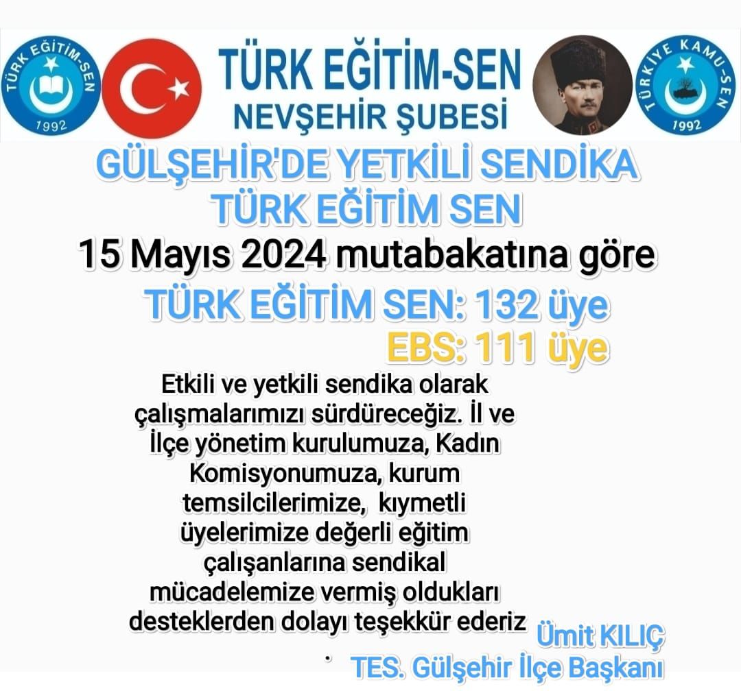 Türk Eğitim Sen Gülşehir’de 132 Üye Ebs 111 üye 21 farkla, TES yetkili sendika olmuştur.