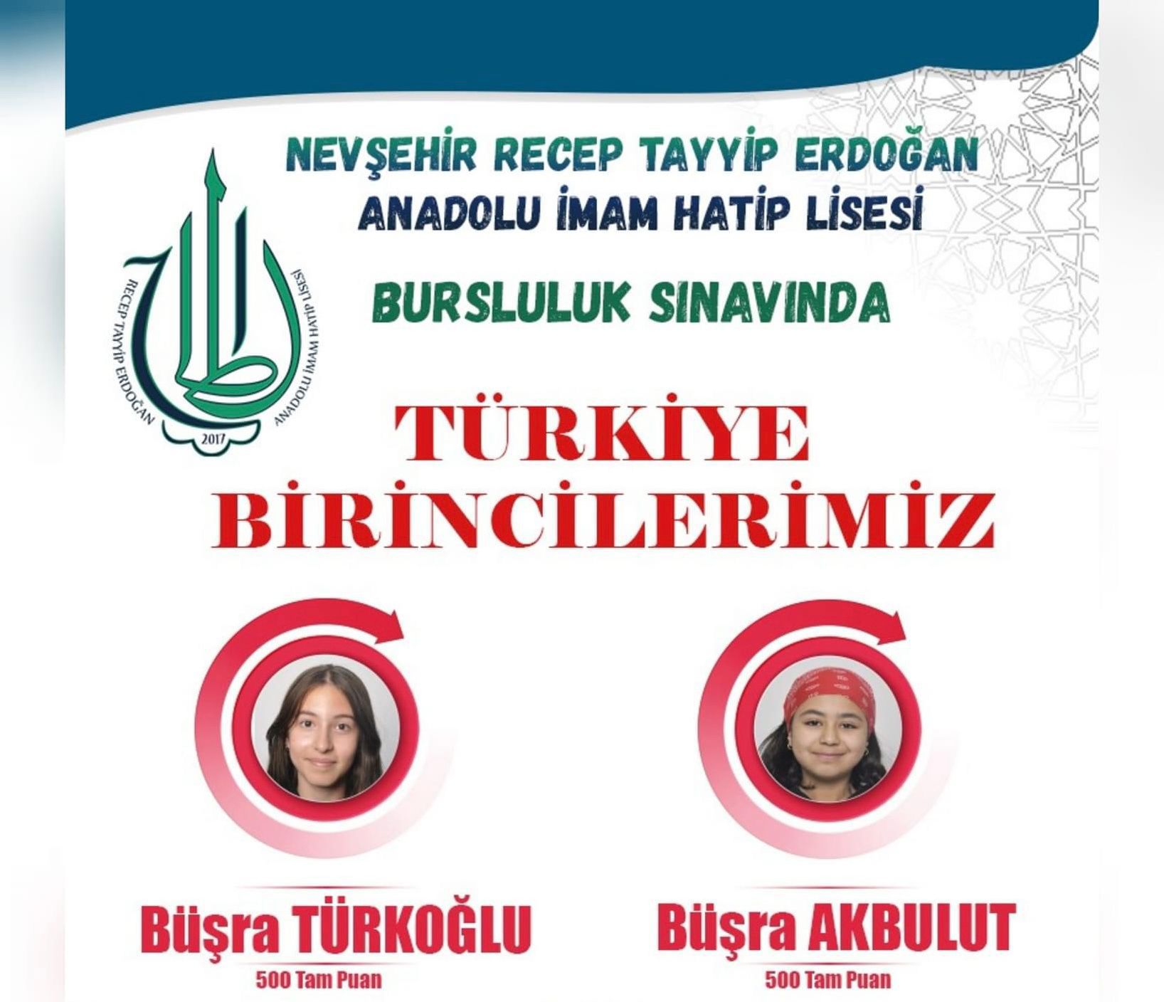 İlköğretim ve Ortaöğretim Kurumları Bursluluk Sınavı’nda Recep Tayyip Erdoğan Proje İmam Hatip Lisesi öğrencilerinden Büşra TÜRKOĞLU ve Büşra AKBULUT, 500 tam puan alarak TÜRKİYE 1.si oldular.
