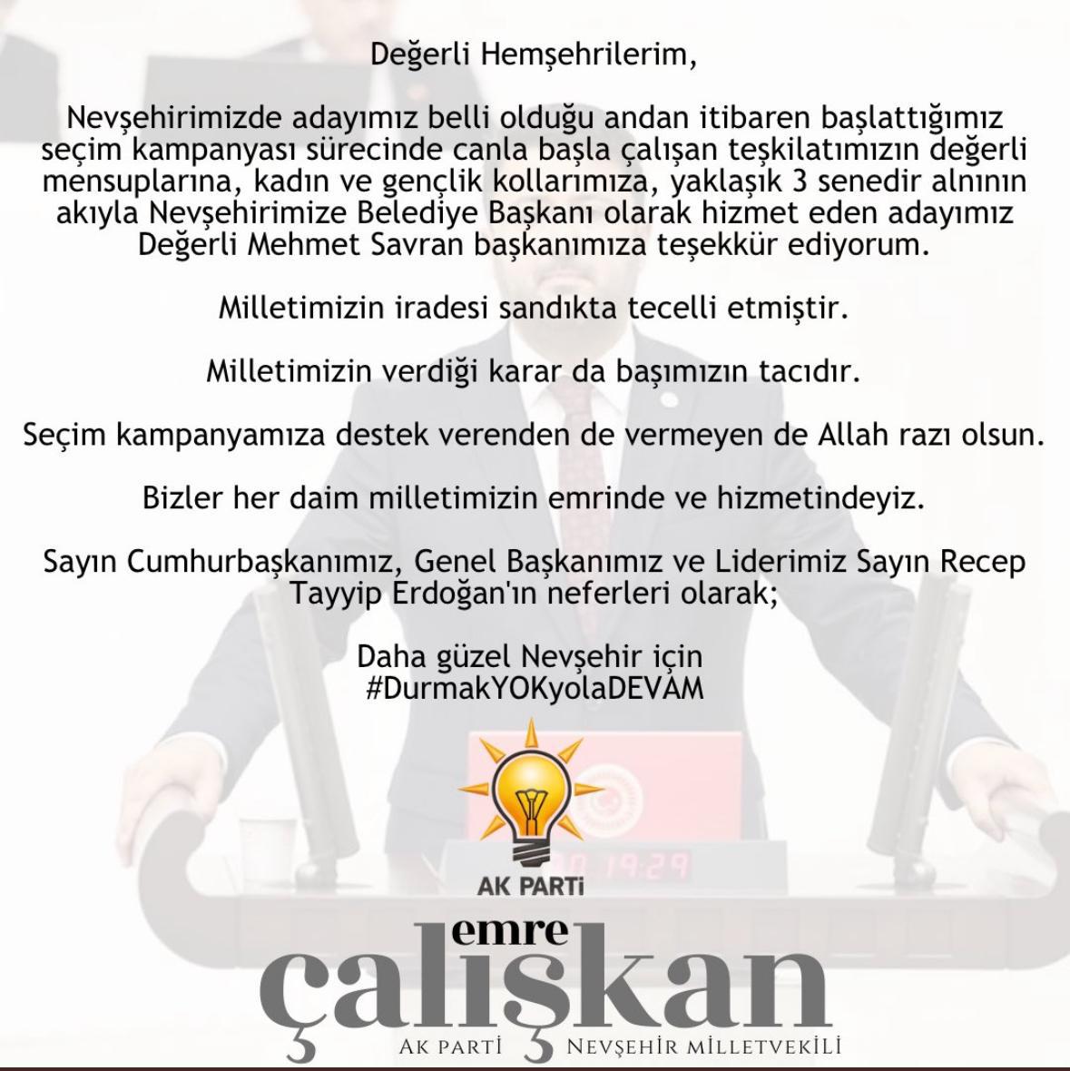Çalışkan yayınladığı mesajda “Değerli Hemşehrilerim, Nevşehirimizde adayımız belli olduğu andan itibaren başlattığımız seçim kampanyası sürecinde canla başla çalışan teşkilatımızın değerli mensuplarına, kadın ve gençlik kollarımıza, yaklaşık 3 senedir alnının akıyla Nevşehirimize Belediye Başkanı olarak hizmet eden adayımız Değerli Mehmet Savran başkanımıza teşekkür ediyorum. Milletimizin iradesi sandıkta tecelli etmiştir. Milletimizin verdiği karar da başımızın tacıdır. Seçim kampanyamıza destek verenden de vermeyen de Allah razı olsun. Bizler her daim milletimizin emrinde ve hizmetindeyiz.