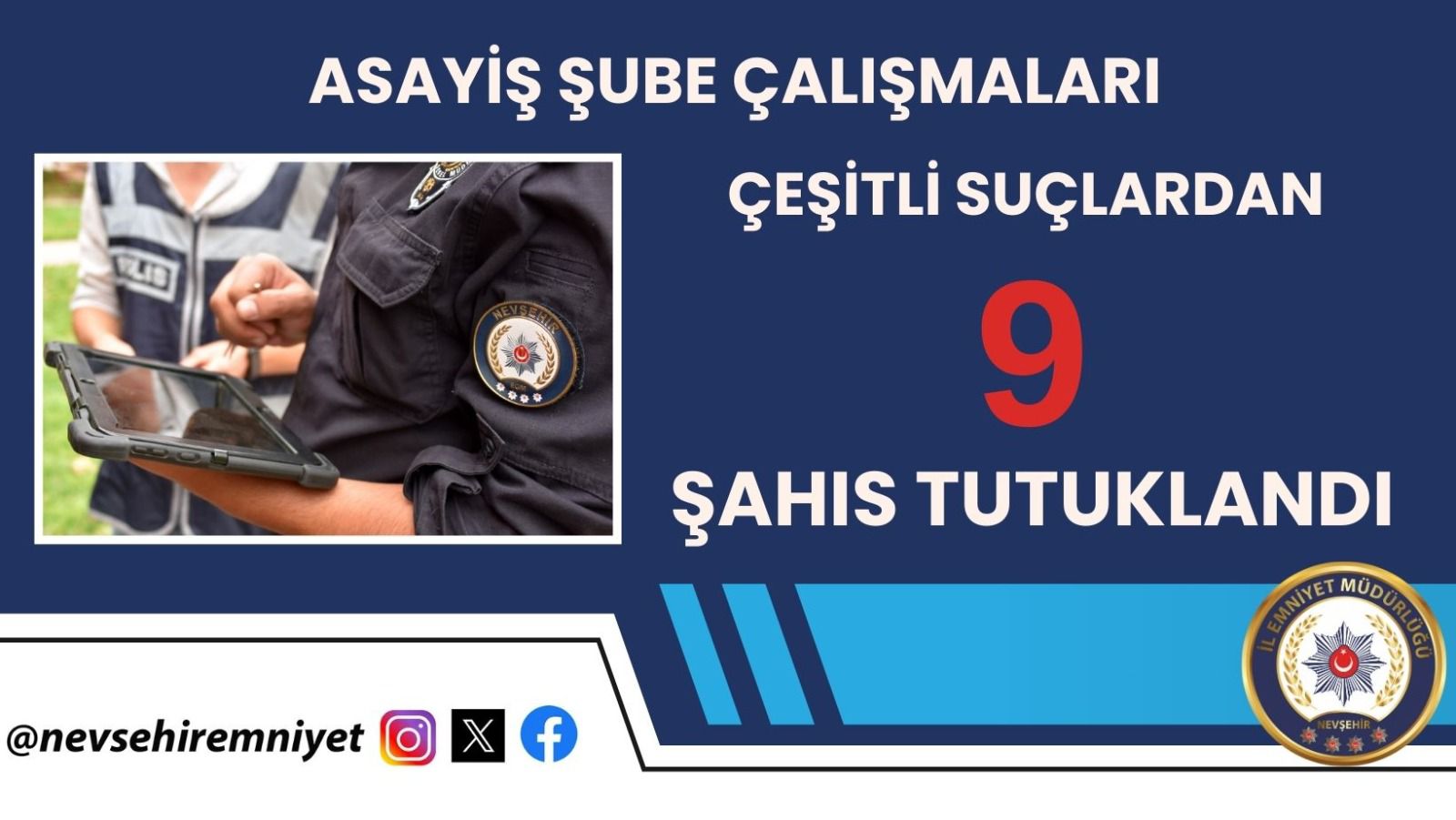 Nevşehir İl Emniyet Müdürlüğü Asayiş Şube Müdürlüğü ekiplerinin çalışması sonucu 9 kişi tutuklandı. Nevşehir Cumhuriyet Başsavcılığı koordinesinde son bir hafta içerisinde yapılan çalışmalarda;