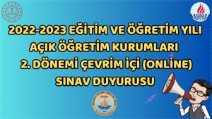 Açık Öğretim Ortaokulu 2022-2023 Eğitim ve Öğretim Yılı 2. Dönem sınavları 24 Nisan 2023 tarihi saat 09.30 ile 30 Nisan 2023 tarihi saat 23.59 arasında çevrim içi (online) olarak yapılacak.