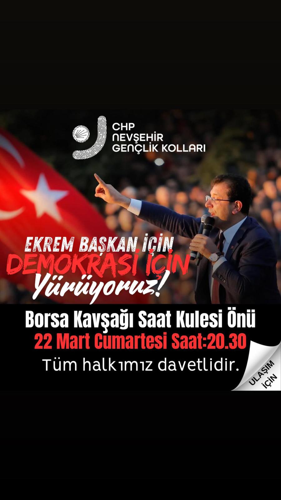 Cumhuriyet Halk Partisi (CHP) Nevşehir Gençlik Kolları, İstanbul Büyükşehir Belediye Başkanı Ekrem İmamoğlu’na destek amacıyla bir demokrasi yürüyüşü düzenleyecek.