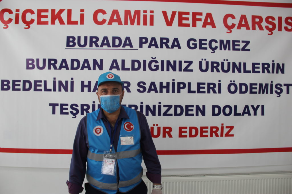 Buraya hayır sahipleri gıda getirdiler. Bizde buraya bir vefa çarşısı kuralım ve bu vefa çarşısında isteyen gelsin istediği ihtiyacını alsın gitsin. Buradan çıkarken de dua etsinler istedik. Şuanda ihtiyaç sahipleri geliyorlar. Burada istediklerini alıyorlar.