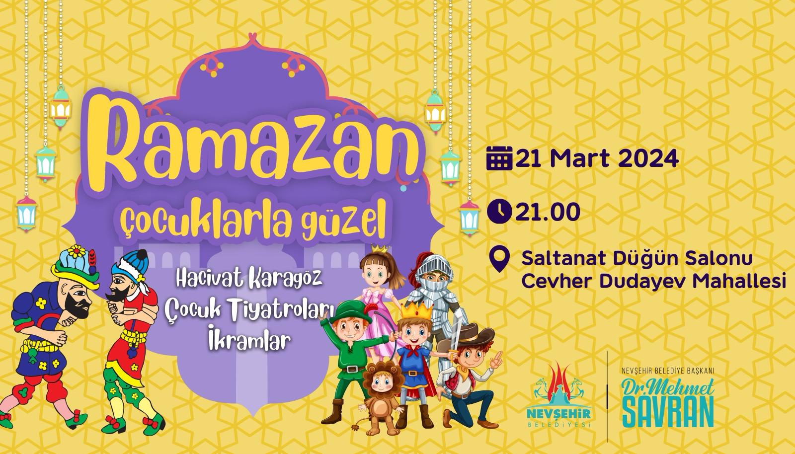 Nevşehir Belediyesi Kültür ve Sosyal İşler Müdürlüğü tarafından “Ramazan Çocuklarla Güzel” teması ile düzenlenen programlar büyük ilgi görüyor. Çocuk tiyatroları, dans ve Karagöz-Hacivat gösterileri gerçekleştirilen programlarda çocuklara ve ailelere Nevşehir Belediyesi tarafından çeşitli ikramlarda bulunularak hediyeler dağıtılıyor.
