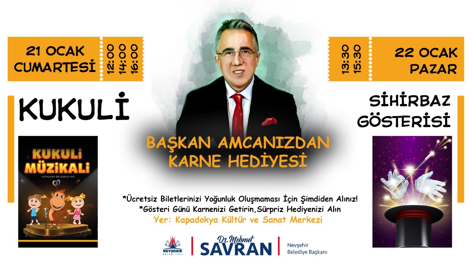 Nevşehir Belediyesi’nin, 20 Ocak Cuma günü karnelerini alarak yarıyıl tatiline girecek olan okul öncesi ve ilköğretim öğrencileri için hafta sonu hazırladığı programa katılmak isteyenler ücretsiz biletlerini Kapadokya Kültür ve Sanat Merkezi’nden alabilecek.