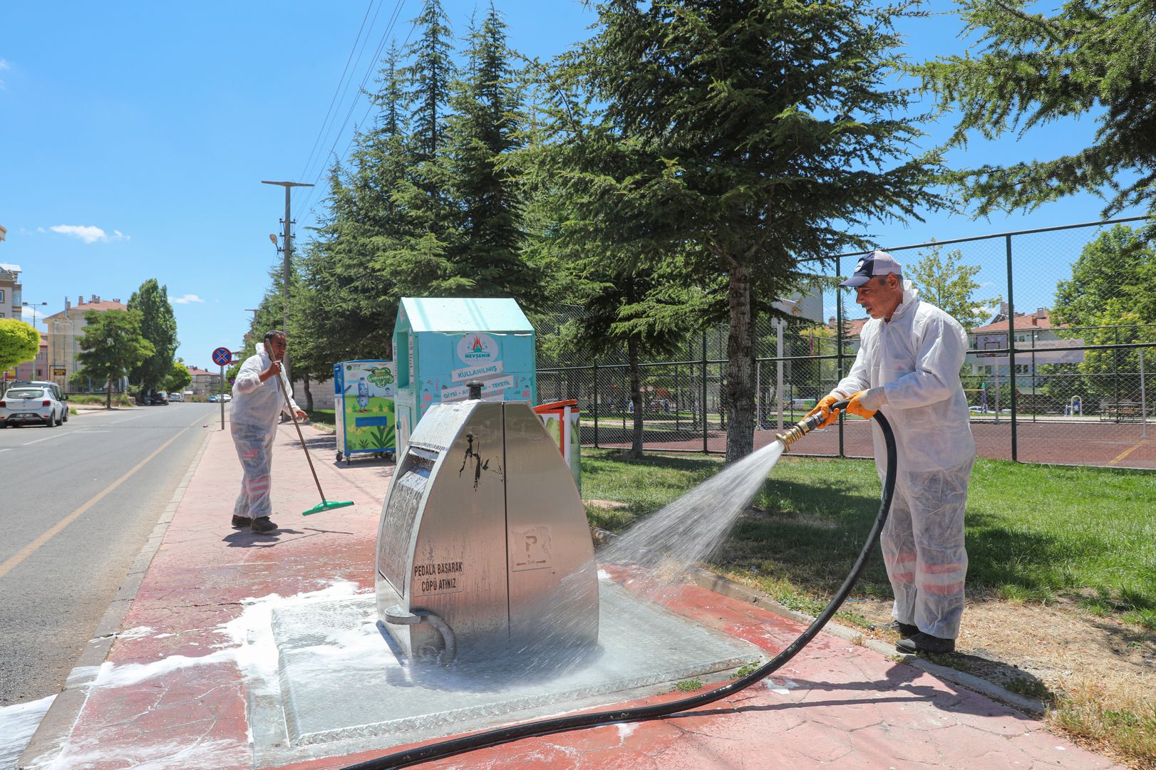 Nevşehir Belediyesi, çöp konteynerlerini kötü koku, kirlilik ve bakterilere karşı rutin yıkama ve dezenfekte işlemini yaz aylarında sıklaştırdı.