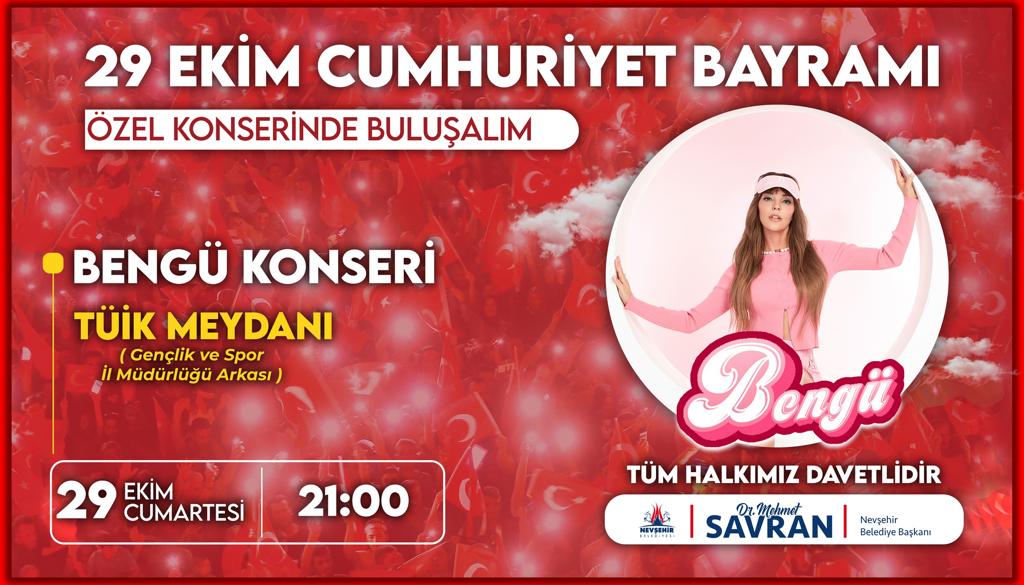 Nevşehir Belediyesi tarafından 29 Ekim Cumhuriyet Bayramı’nın 99. yıl dönümü dolayısıyla TÜİK Meydanı’nda halk konseri düzenlenecek. Türk pop müziğinin sevilen sanatçısı Bengü’nün sahne alacağı konser saat 21.00’de başlayacak.