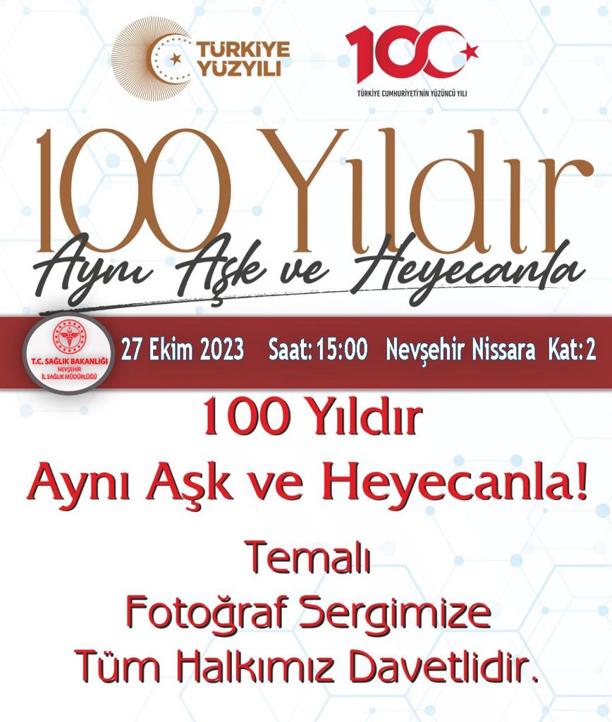 Türkiye Yüzyılı’nın başlangıcı olan Cumhuriyetimizin 100. Yılı farklı etkinliklerle kutlanmaktadır. Bu kapsamda Cumhuriyetin 100. Yılı münasebetiyle “100 Yıldır Aynı Aşk ve Heyecanla” temalı bir fotoğraf sergisi düzenlenecektir. Cumhuriyetin ilk yıllarında sunulan sağlık hizmetlerine dair çok sayıda siyah beyaz fotoğraf arşivlerdeki yerini almıştır. Genç cumhuriyetin köy köy gezip tedavi yapan doktorları, fedakarca çalışan hemşireleri ve canla başla görev yapan sağlık çalışanlarının imkansızlıklar içerisindeki mücadelelerine dair çok sayıda fotoğraf karesi bulunmaktadır. Tam 100 yıl sonra bugün, artık imkansızlıklarla değil çağın en ileri teknolojileri ile ön plana çıkmaktayız. Binalar, teknolojiler, imkanlar değişse de sağlık çalışanlarının aşk ve heyecanı hiç değişmemiştir. Buradan ilhamla cumhuriyetin ilk yıllarında hizmet veren sağlık çalışanlarına ve sağlık hizmetlerine ait fotoğraflar günümüze uyarlanmıştır. Söz konusu fotoğraf sergisi 81 il ve 16 şehir hastanesinde açılacaktır. Fotoğraflar, şehir meydanı, AVM, metro istasyonu, tren garı, sergi salonu veya kültür merkezi gibi şehrin sembolik noktalarında sergilenecektir. 27 Ekim Cuma günü 81 ilde eş zamanlı olarak sergi açılışı yapılacak olup fotoğraflar 27 Ekim-3 Kasım tarihleri arasında 1 hafta süreyle halkın ziyaretine açık olacaktır.