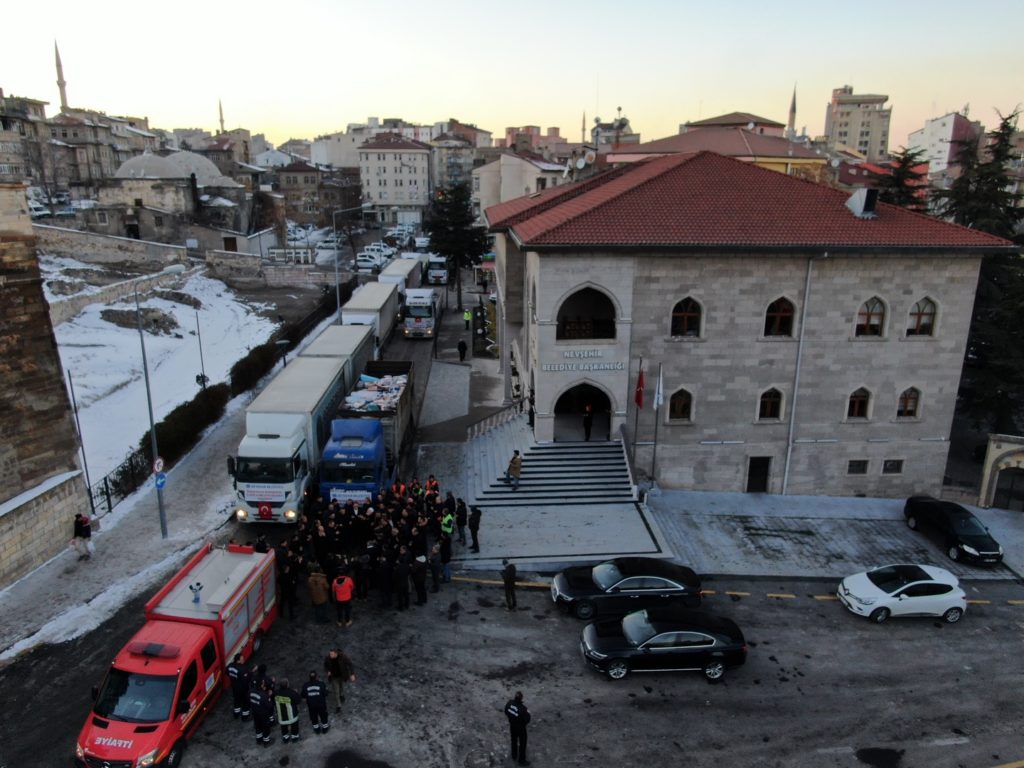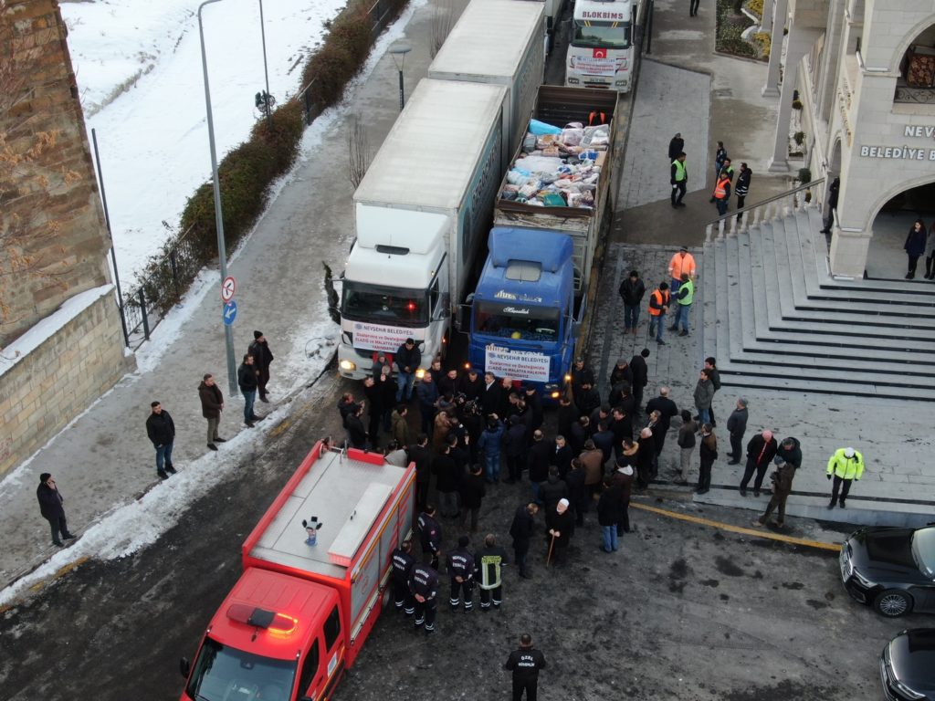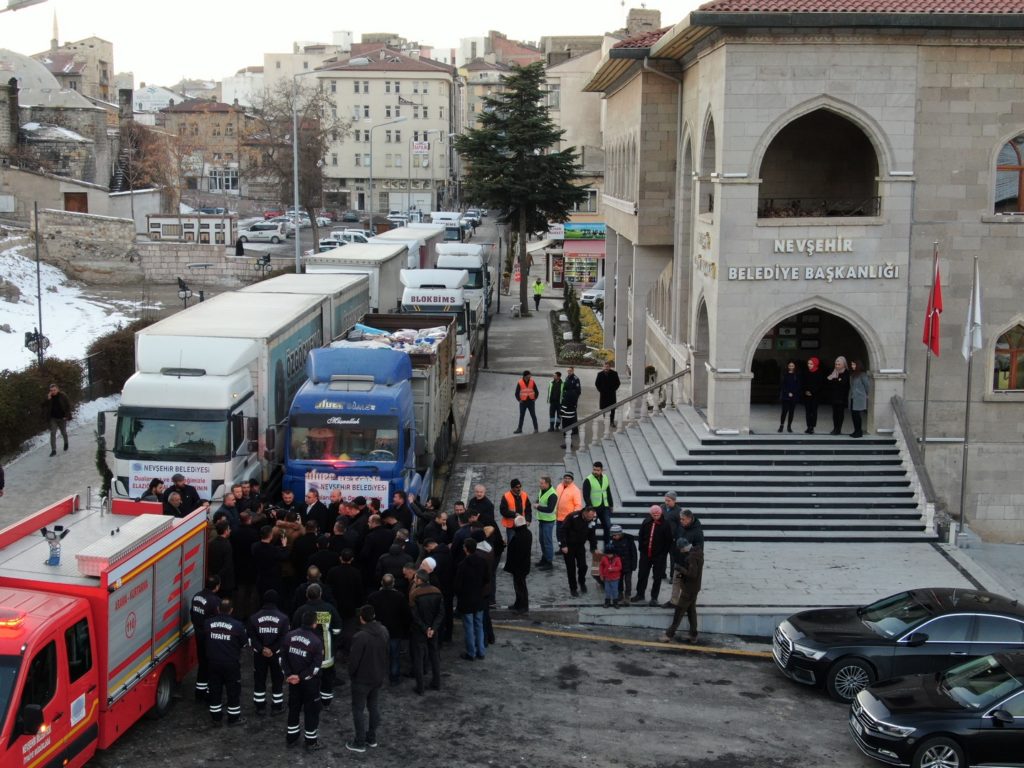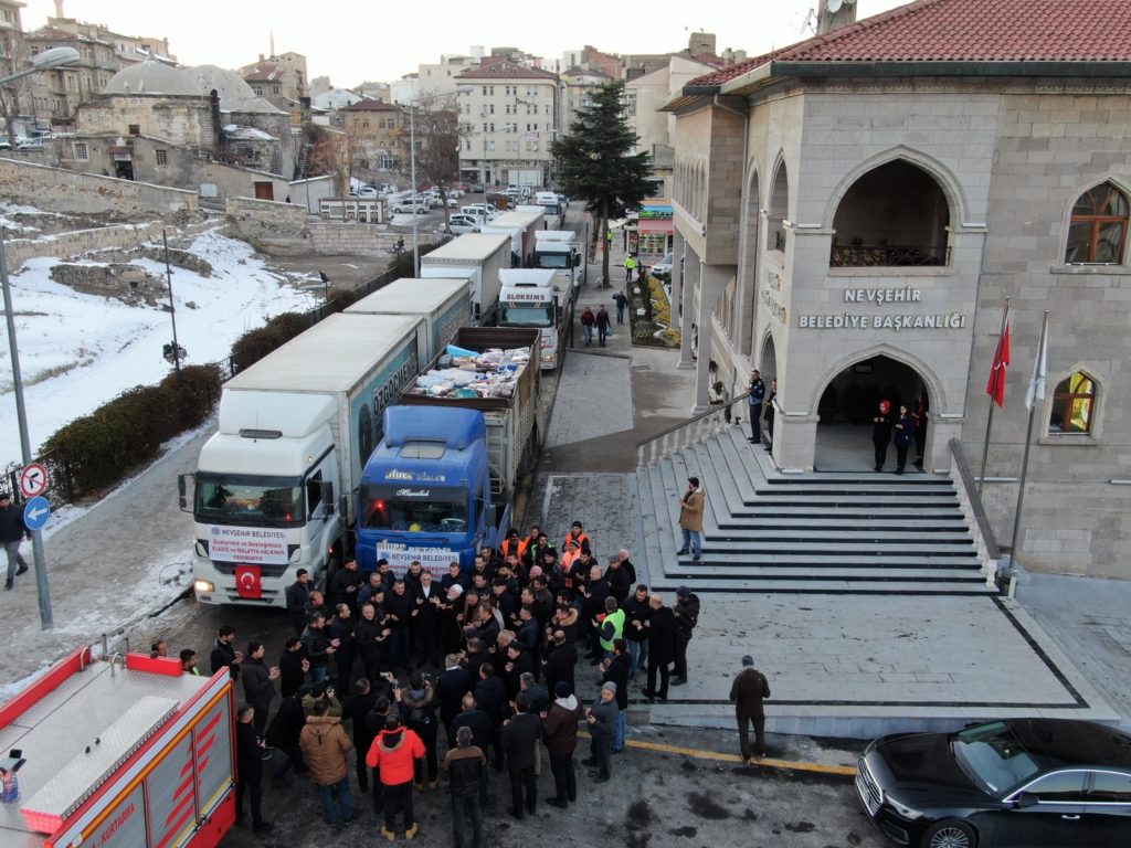 Nevşehir Belediyesi’ne hayırsever vatandaşlar ve iş adamları tarafından getirilen su, süt, battaniye, ısıtıcı, kuru bakliyat ve çocuk kıyafetinden oluşan yardım tırlarının hareketi öncesinde uğurlama töreni düzenlendi.