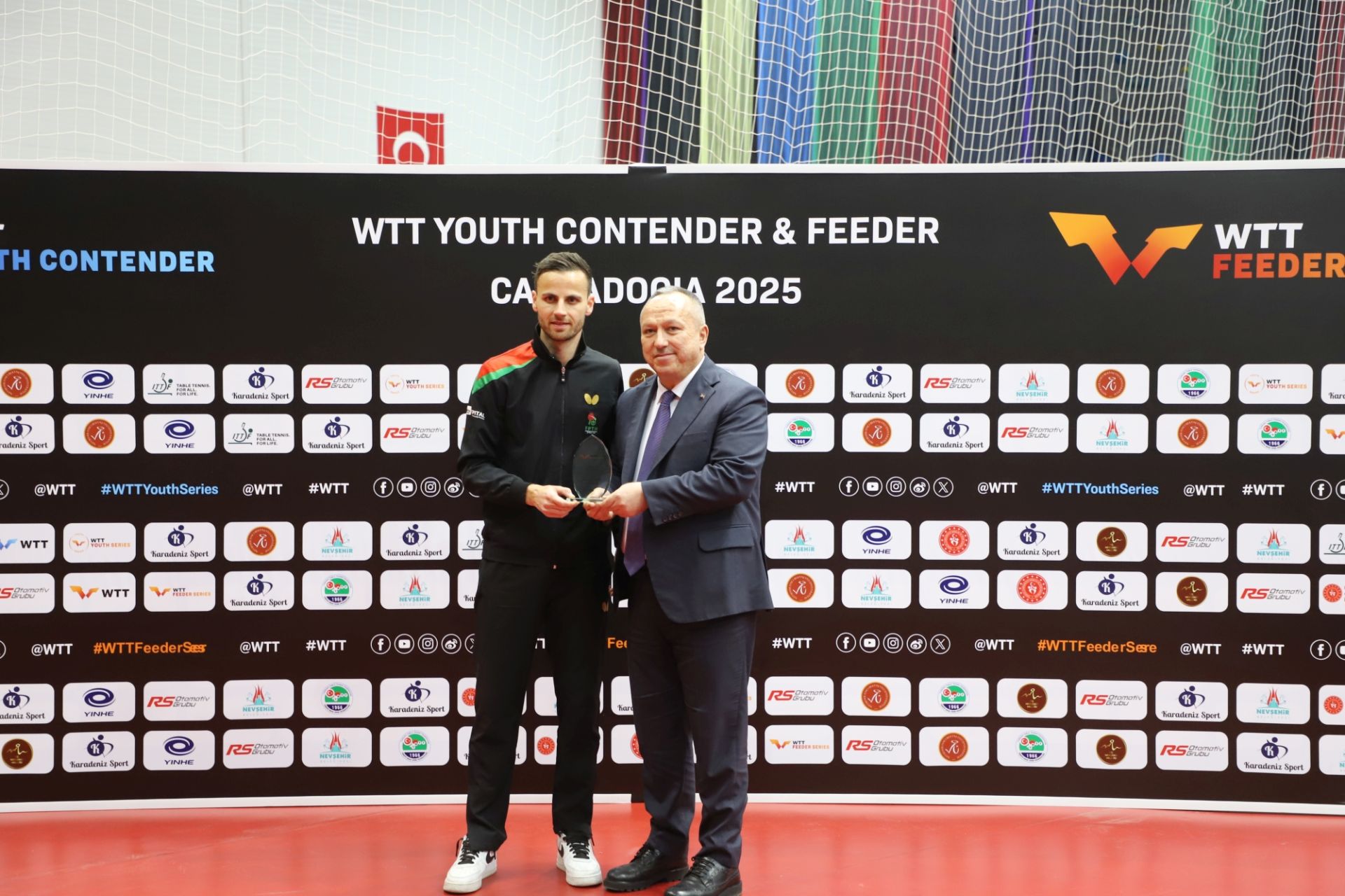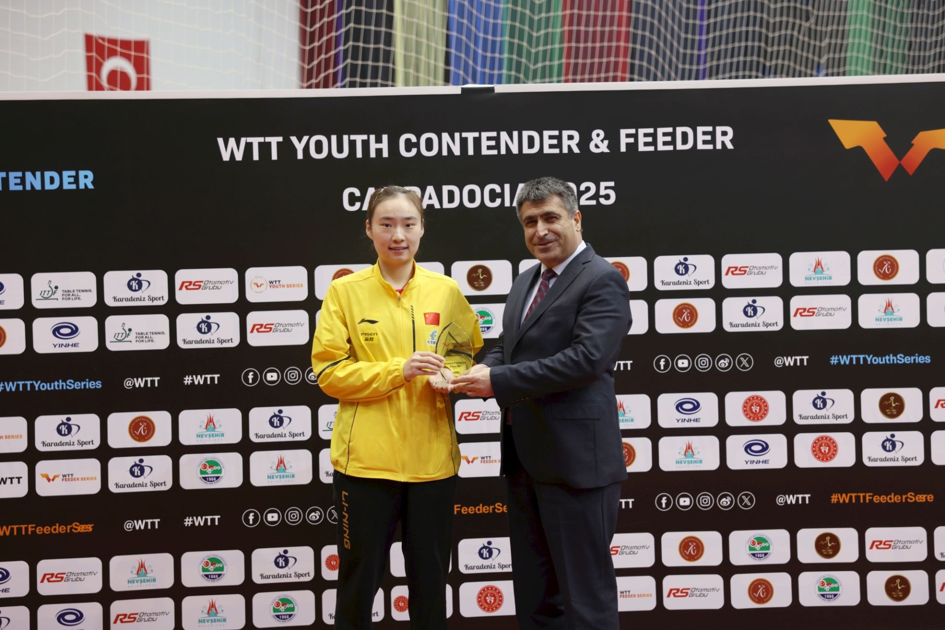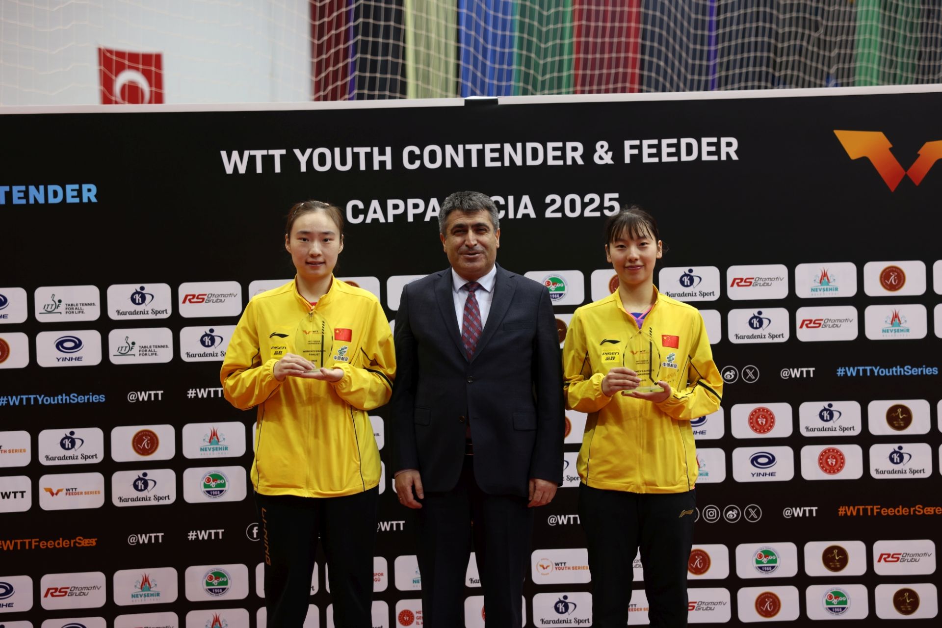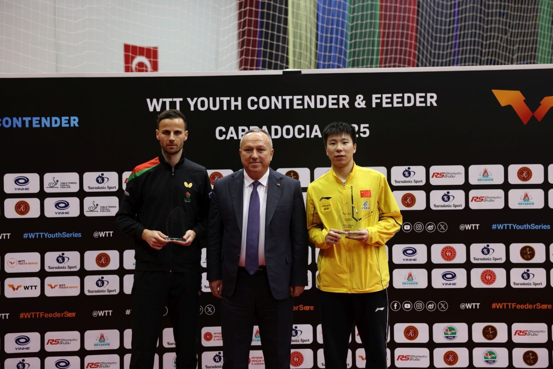 WTT Feeder Cappadocia 2025 (Büyükler) müsabakalarında erkeklerde 1. olan Çinli sporcu Yingbin Xu ve 2. olan Portekizli sporcu Tiago Apolonia’ya ödüllerini Nevşehir Valisi Ali Fidan verirken bayanlarda 1. olan Çinli sporcu Yiyun Yang ve 2. olan Çinli sporcu Xiaotong Wang’a ödüllerini NEVÜ Rektörü Prof. Dr. Semih Aktekin verdi.