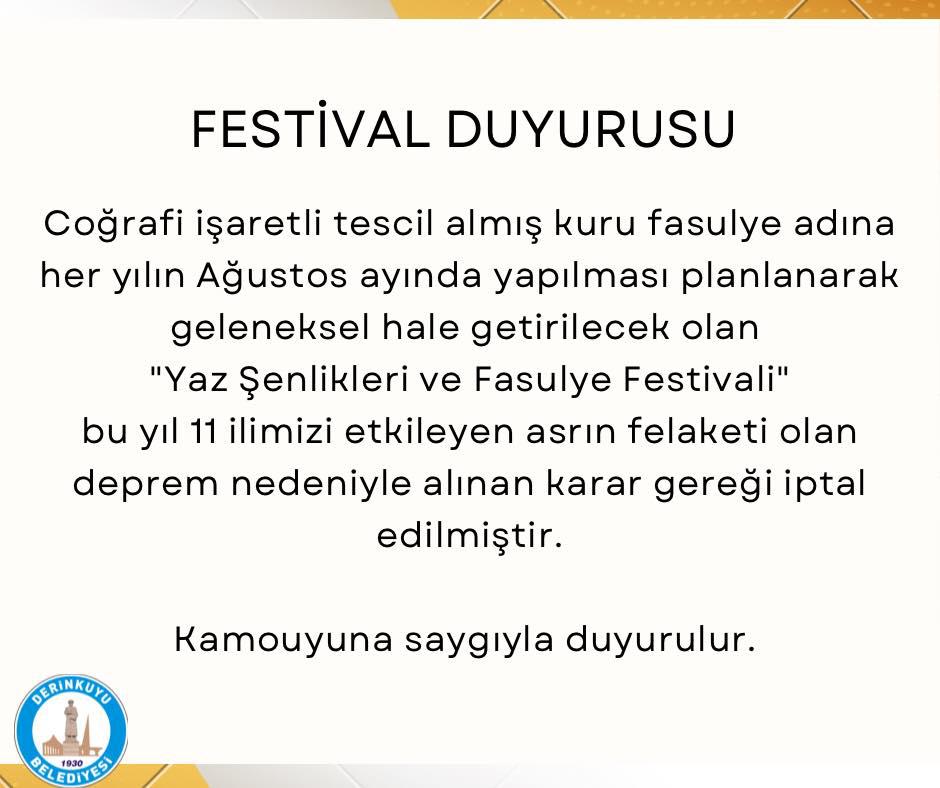 Konuya ilişkin yapılan açıklamada, “Coğrafi işaretli tescil almış Fasulye adına her yıl ağustos ayında yapılması planlanarak geleneksel hale getirilecek olan “Yaz Şenlikleri ve Fasulye Festivali” bu yıl Ülkemizin 11 ilinde yaşanan deprem felaketi nedeniyle yapılmayacaktır. Kamuoyuna duyurulur” denildi.
