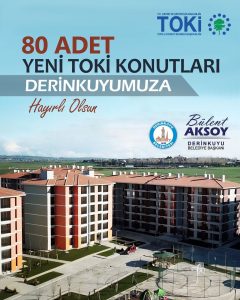 Konuya ilişkin Derinkuyu Belediye Başkanı Bülent Aksoy, “Derinkuyu’muza 2.Etap Toki Konutları Hayırlı Olsun. Cumhurbaşkanımız Sn. Recep Tayyip Erdoğan tarafından cumhuriyet tarihinin en büyük sosyal konut projesi açıklandı. Proje kapsamında 2. etap 80 adet sosyal konut ilçemize hayırlı ve uğurlu olsun. Desteklerinden dolayı başta Cumhurbaşkanımız Sn. Recep Tayyip Erdoğan’a, Çevre, Şehircilik ve İklim Değişikliği Bakanımız Sn. Murat Kurum’a TOKİ Başkanımız Sn. Ömer Bulut’a İl Başkanımız Sn. Ali Kemikkıran’a Millet Vekillerimiz Sn. Mustafa Açıkgöz ve Sn. Yücel Menekşe’ye şahsım ve ilçem şükranlarımı arz ediyorum. İlçemizde inşa edilecek 80 konut için başvurular başlamıştır. Başvurular 2 seçenek olarak yapılacaktır; İlçemiz Derinkuyu Ziraat Bankası Şubesinden 14.09.2022 – 31.10.2022 tarihleri arasında kabul edilecektir. E-Devlet aracılı ile 14.09.2022 – 28.10.2022 tarihleri arasında kabul edilecektir” ifadelerinde bulundu.