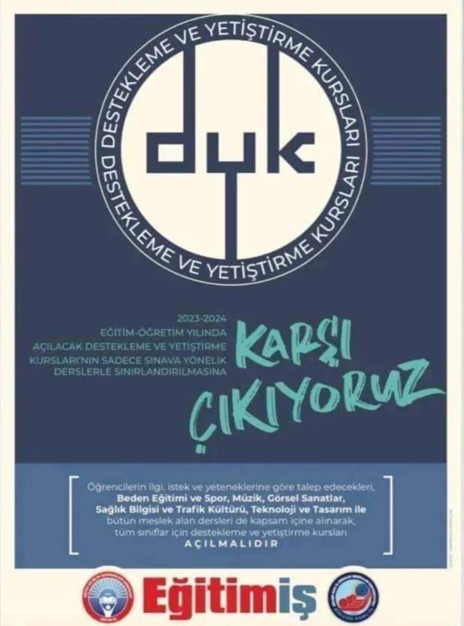 Öğrencilerin ilgi, istek ve yeteneklerine göre talep edecekleri, Beden Eğitimi, Spor, Müzik, Görsel Sanatlar, Sağlık Bilgisi ve Trafik Kültürü, Teknoloji ve Tasarım, Bilişim Teknolojileri gibi DYK açılmayan tüm meslek alan derslerini de kapsayacak şekilde, ortaokul ve liselerdeki tüm sınıflarda açılmasını, çalışma gruplarının; sınıf, yaş gözetilmeden öğrenci yetenek ve ilgisine göre oluşturulmasını talep ediyoruz.