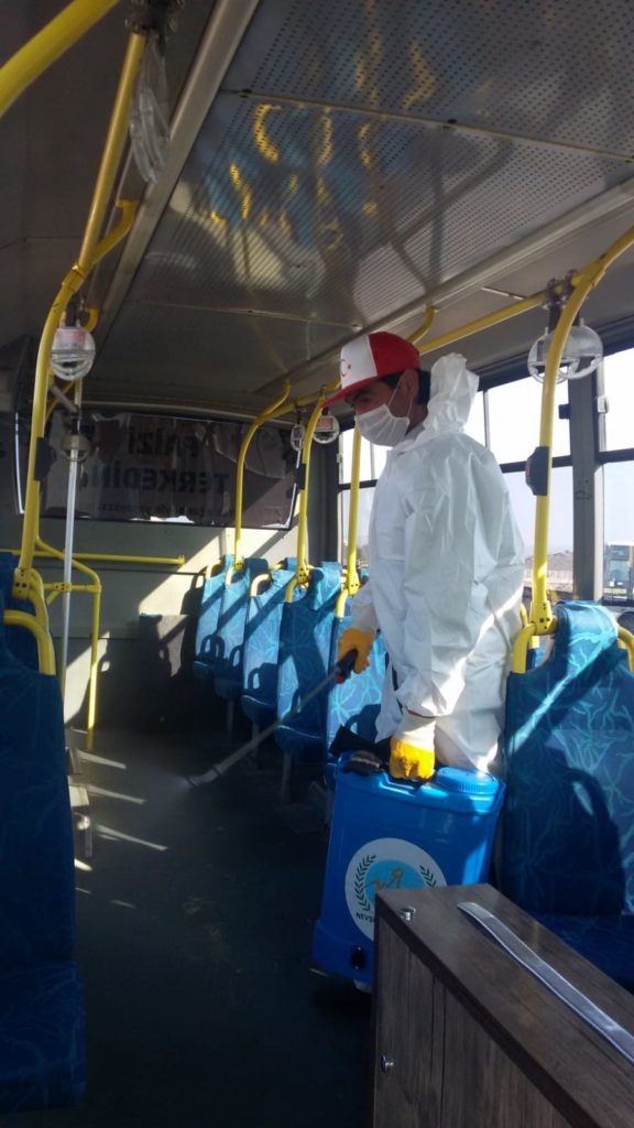 Şehir içi toplu ulaşım hizmeti veren tüm otobüsleri düzenli olarak bakteri ve virüslere karşı dezenfekte eden ekipler, duraklarda da sık sık temizlik ve ilaçlama yapıyor.