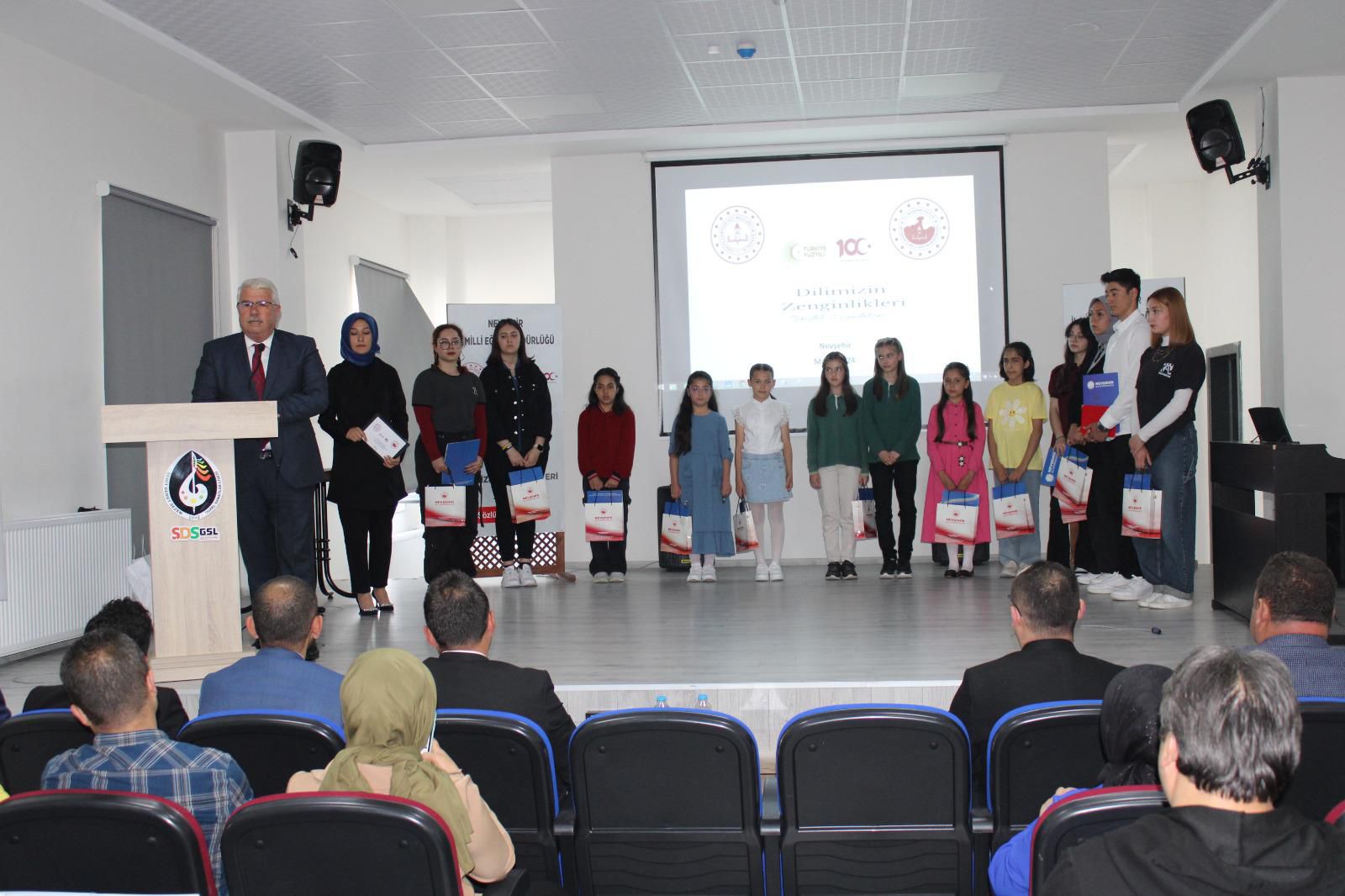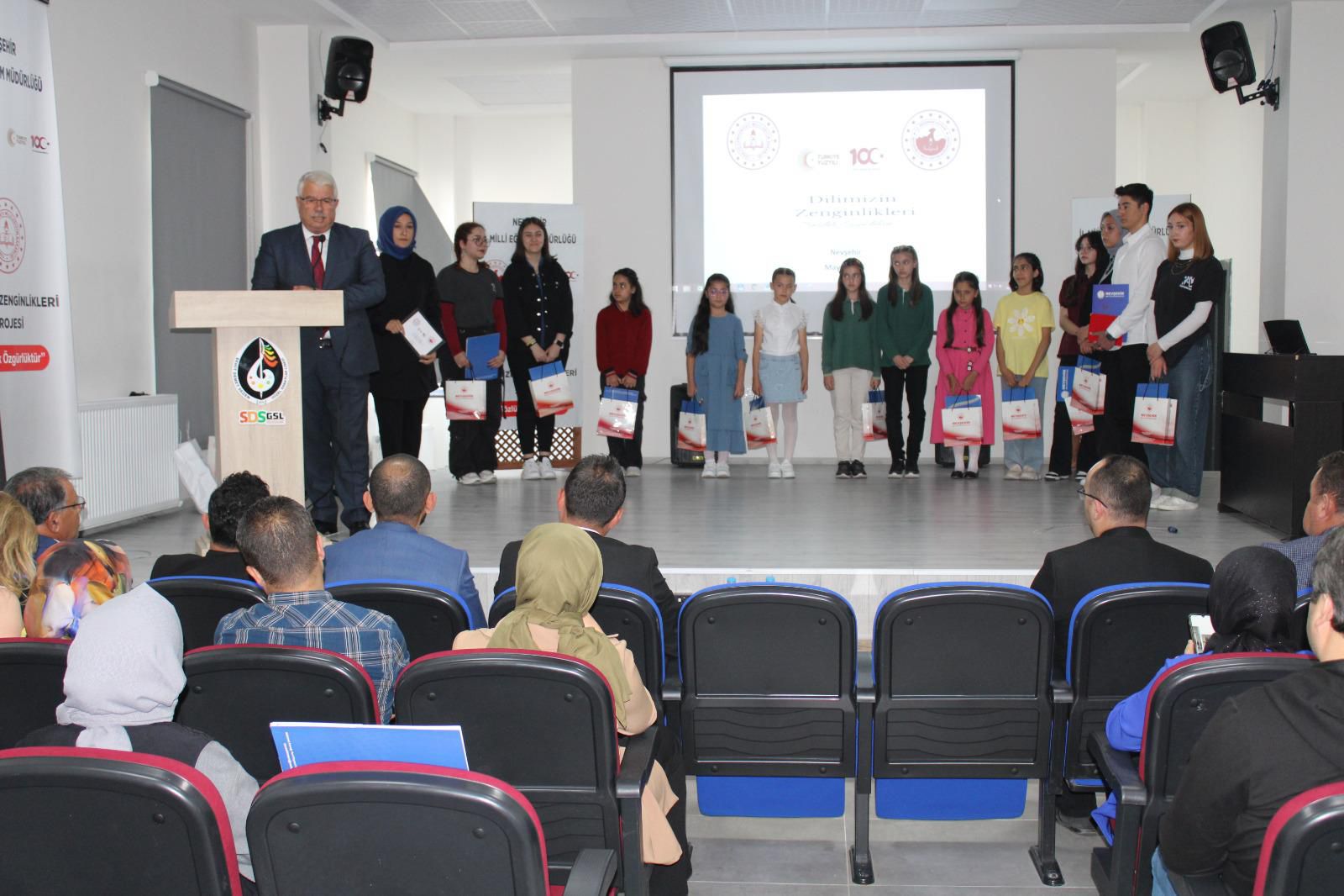 Milli Eğitim Bakanlığı tarafından 2023-2024 Eğitim Öğretim yılında başlatılan “Dilimizin Zenginlikleri Projesi”nin kapanış programı Şehit Demet Sezen Güzel Sanatlar Lisesi konferans salonunda yapıldı. Programa İl Milli Eğitim Müdürü Yusuf YAZICI, şube müdürü Fatih GÜNKAN, idareciler, öğretmenler ve öğrenciler katıldı. İl Müdürü, yarışmalarda dereceye giren öğrencilerimize ödüllerini takdim etti. Projeye katkı sunan öğretmen ve idarecilere de teşekkür belgeleri verildi. “Dilimizin Zenginlikleri Projesi” kapsamında eğitim sürecince ilköğretim ve ortaöğretim kurumlarında Milli Eğitim Bakanlığı eylem planları çerçevesinde sınıf içi etkinlikler, duvar panoları, oyunlar, çeşitli faaliyetler yapıldı. Okul içi faaliyetlerin yanında il geneli yarışmalar düzenlendi ve plaketler, çeşitli hediyeler verildi.