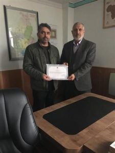 Din Görevlisi Rüştü Kıvanç’a Diyanet İşleri Başkanlığı tarafından gönderilen teşekkür belgesi İlçe Müftüsü Harun Özkan tarafından makam odasında takdim edildi.