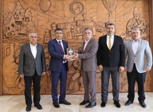 NEVÜ Rektörlüğünün daveti ile ‘1. Kapadokya Kültürel Miras Festivali’  ve NEVÜ Sezai Karakoç Öğrenci Yaşam Merkezi’nde yer alan Diyanet İşleri Başkanlığı Kitap Satış Ofisi’nin açılışına katılmak üzere üniversitede bulunan Diyanet İşleri Başkanlığı Başkanlık Müşaviri Ahmet Belada ve beraberindeki heyet, Rektör Prof. Dr. Semih Aktekin’i makamında ziyaret ederek başarılı çalışmalarının devamı temennisinde bulundu.