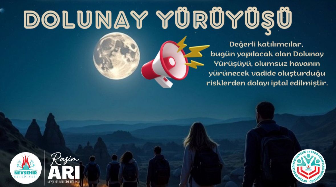 Nevşehir Belediyesi Gençlik ve Spor Hizmetleri Müdürlüğü tarafından bugün akşam saatlerinde yapılması planlanan Dolunay Yürüyüşü iptal edildi.