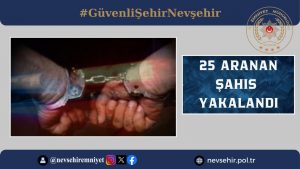 Nevşehir Emniyet Müdürlüğü Ekipleri tarafından son bir hafta içerisinde ilimiz genelinde aranan şahısların yakalanmasına yönelik yapılan çalışmalarda 25 kişi gözaltına alındı.