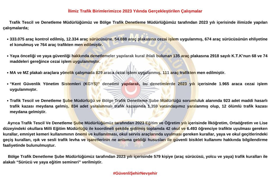 Nevşehir il geneli Trafik Birimlerince 2023 Yılında gerçekleştirilen çalışmalar paylaşıldı. Trafik Tescil ve Denetleme Müdürlüğü ve Bölge Trafik Denetleme Müdürlüğü tarafından 2023 yılı içerisinde ilimizde yapılan çalışmalarda; 333.075 araç kontrol edilirken, 12.334 araç sürücüsüne, 54.888 araç plakasına cezai işlem uygulanmış, 674 araç sürücüsünün ehliyetine el konulmuş ve 764 araç trafikten men edildi.