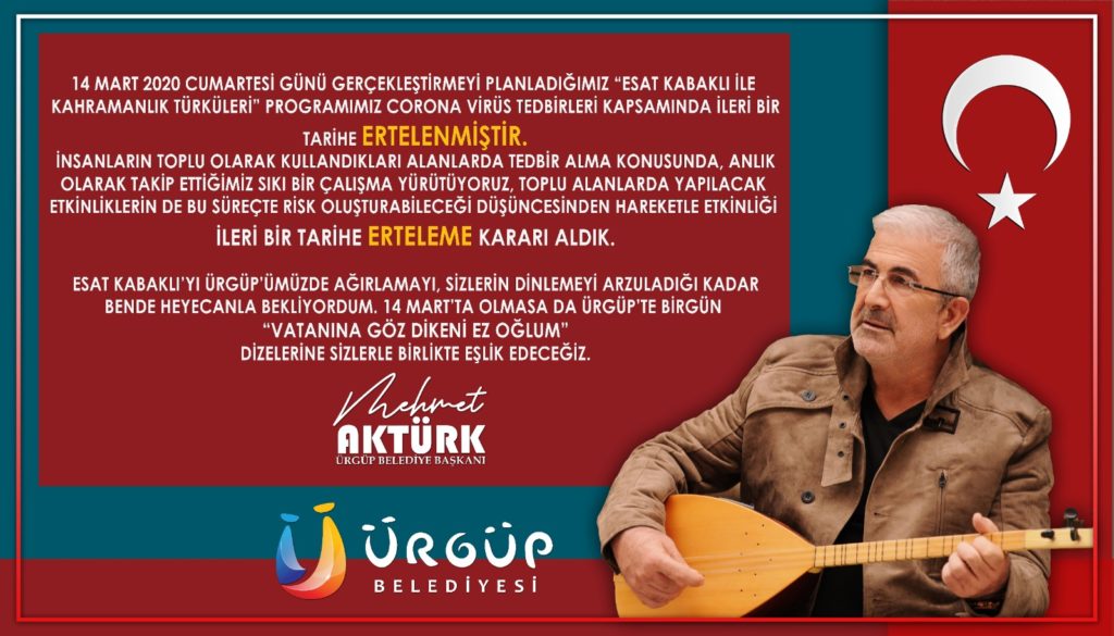 “14 Mart 2020 Cumartesi günü gerçekleştirmeyi planladığımız “Esat Kabaklı ile Kahramanlık Türküleri” programımız korona virüs tedbirleri kapsamında ileri bir tarihe ertelenmiştir.