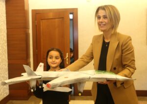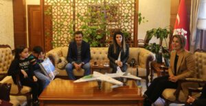 Geçen yıl NASA tarafından Hubble Uzay Teleskobunun 30. yılı için düzenlenen yarışmada yaptıkları karton teleskopla dereceye giren Esila Polat, Vali İnci Sezer Becel’e atık malzemelerden yaptığı savaş uçağını hediye etti.